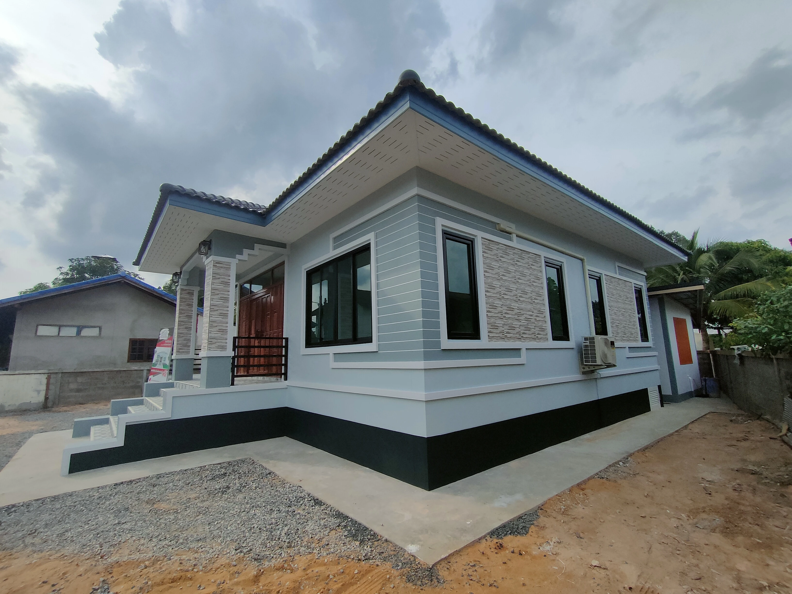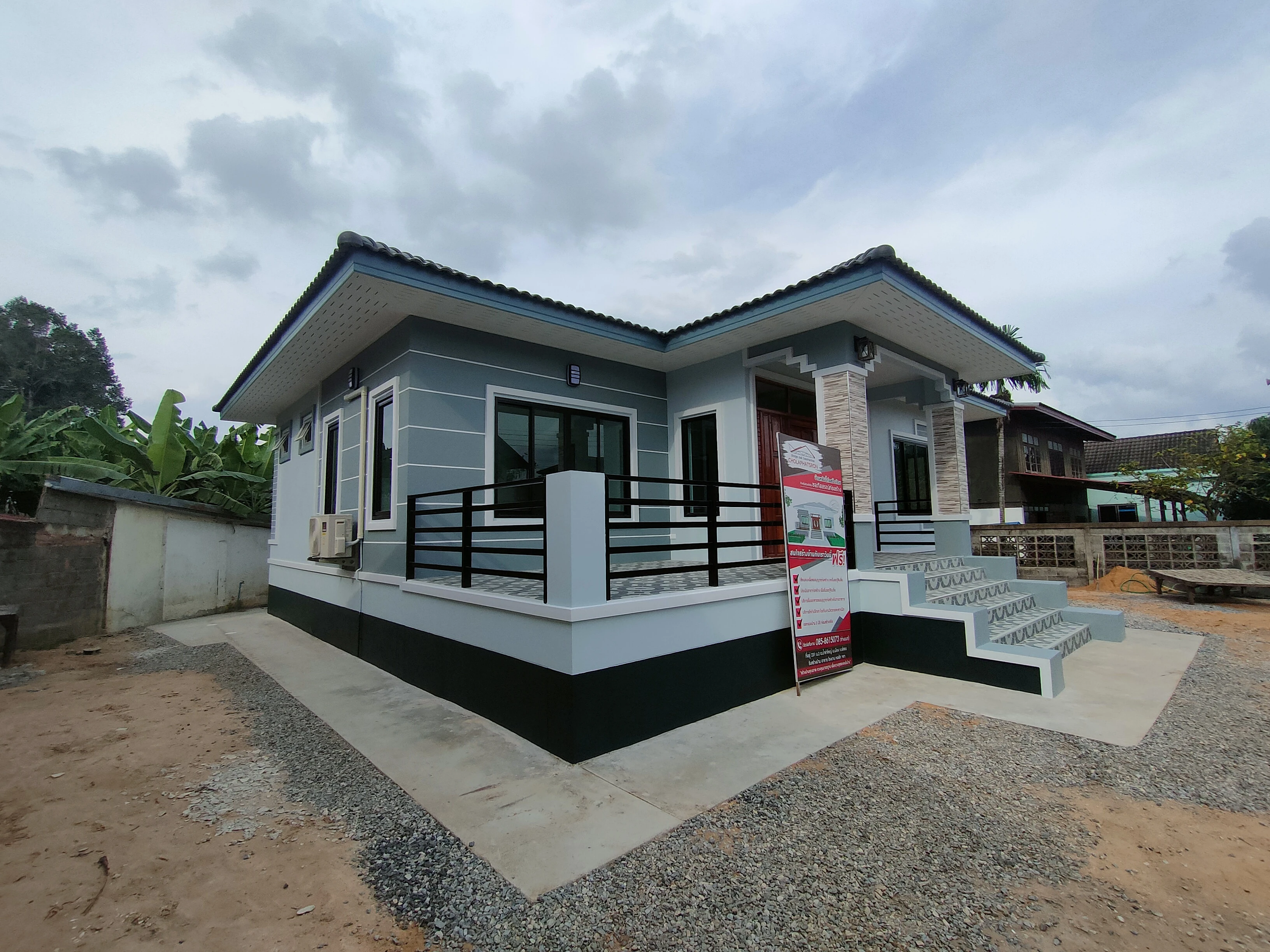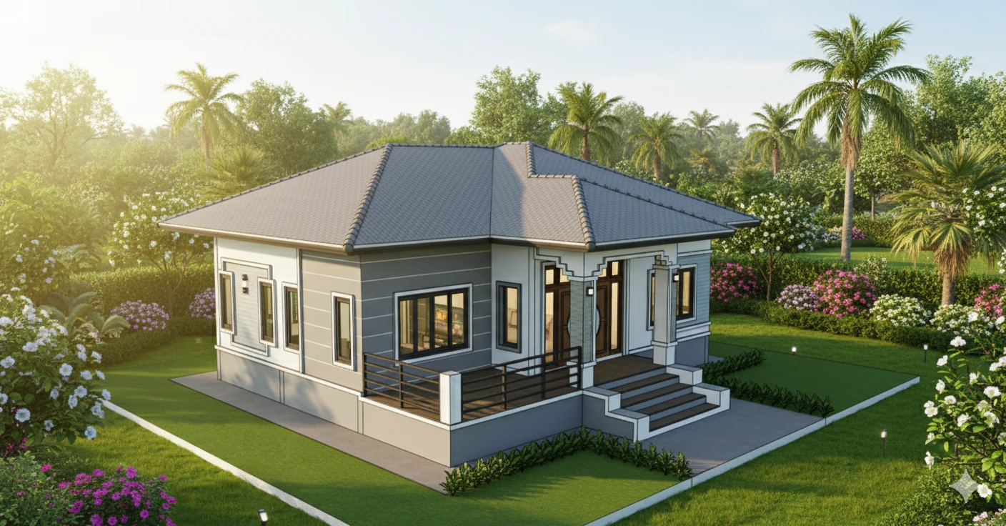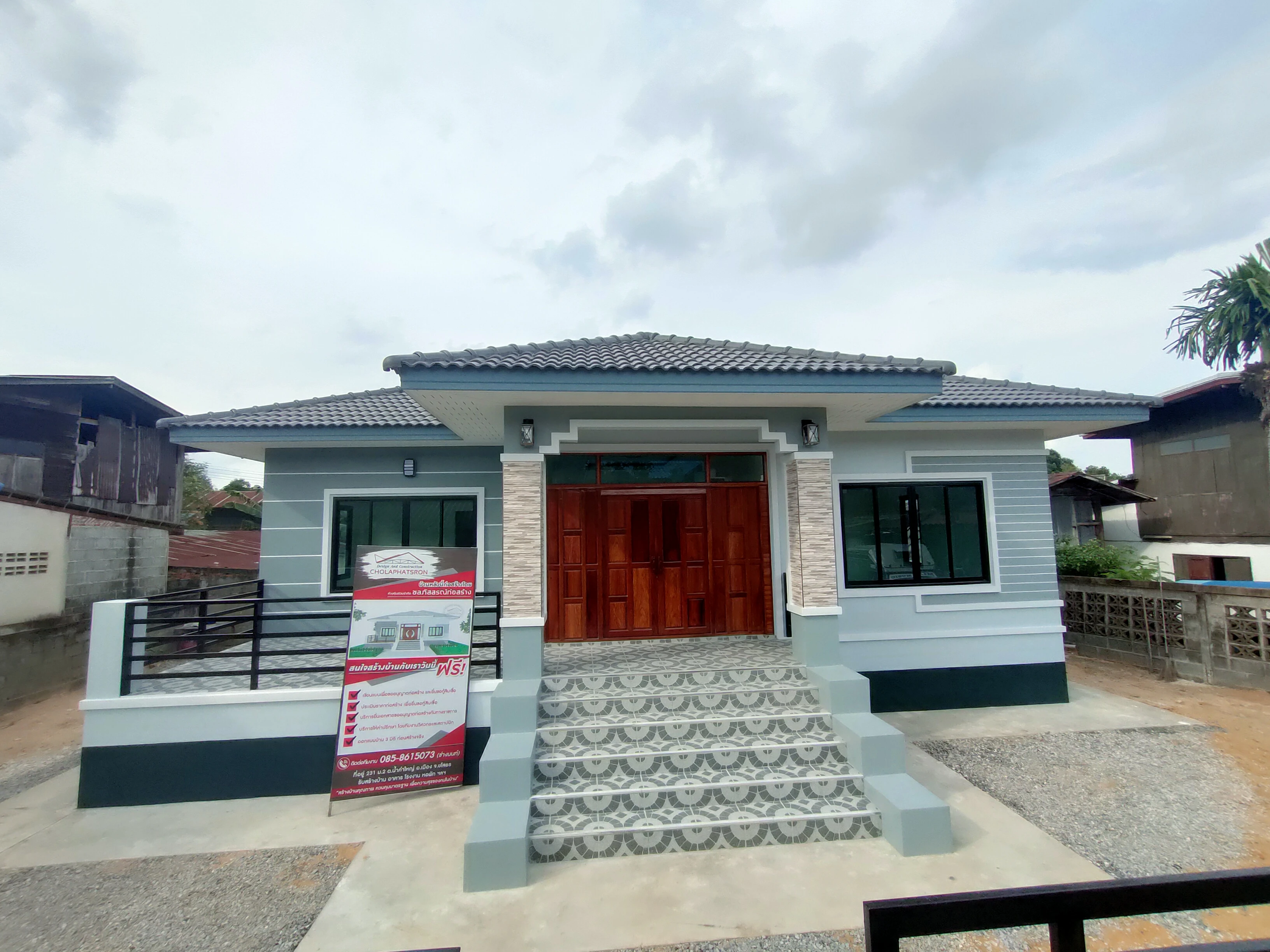 แบบบ้านปั้นหยาชั้นเดียว สไตล์โมเดิร์นร่วมสมัย โดยแบ่งเป็น 3 ห้องนอน 2 ห้องน้ำ 1 ห้องนั่งเล่น 1 ห้องรับประทานอาหาร