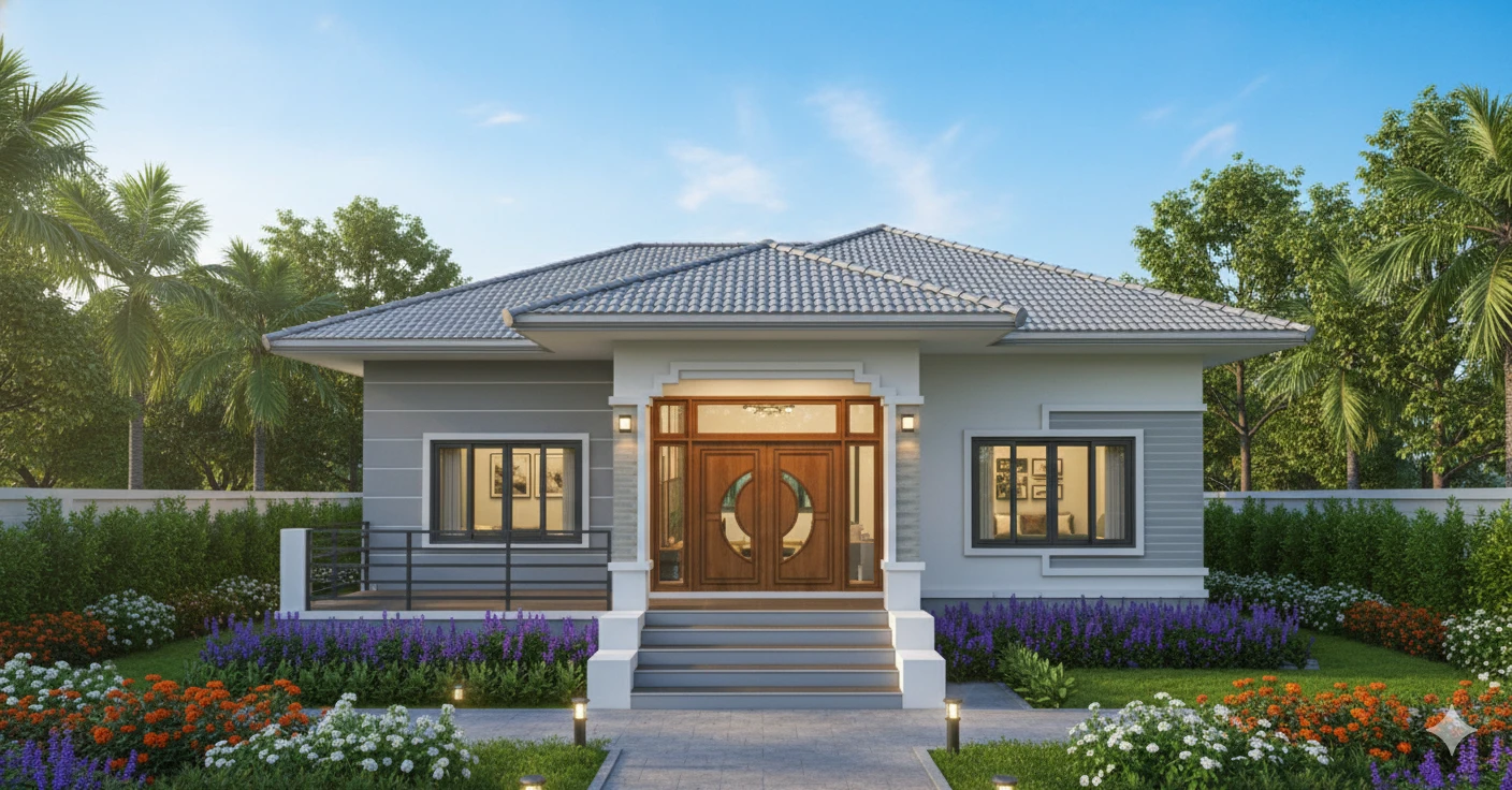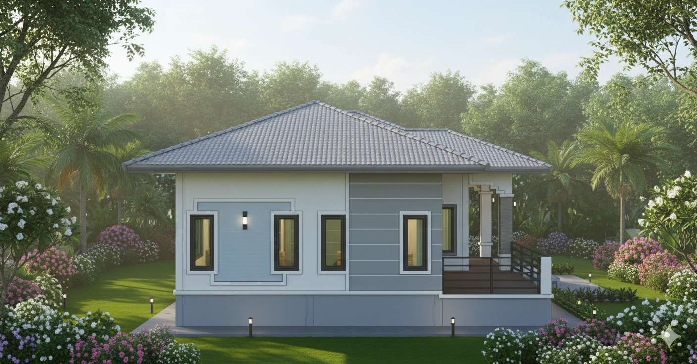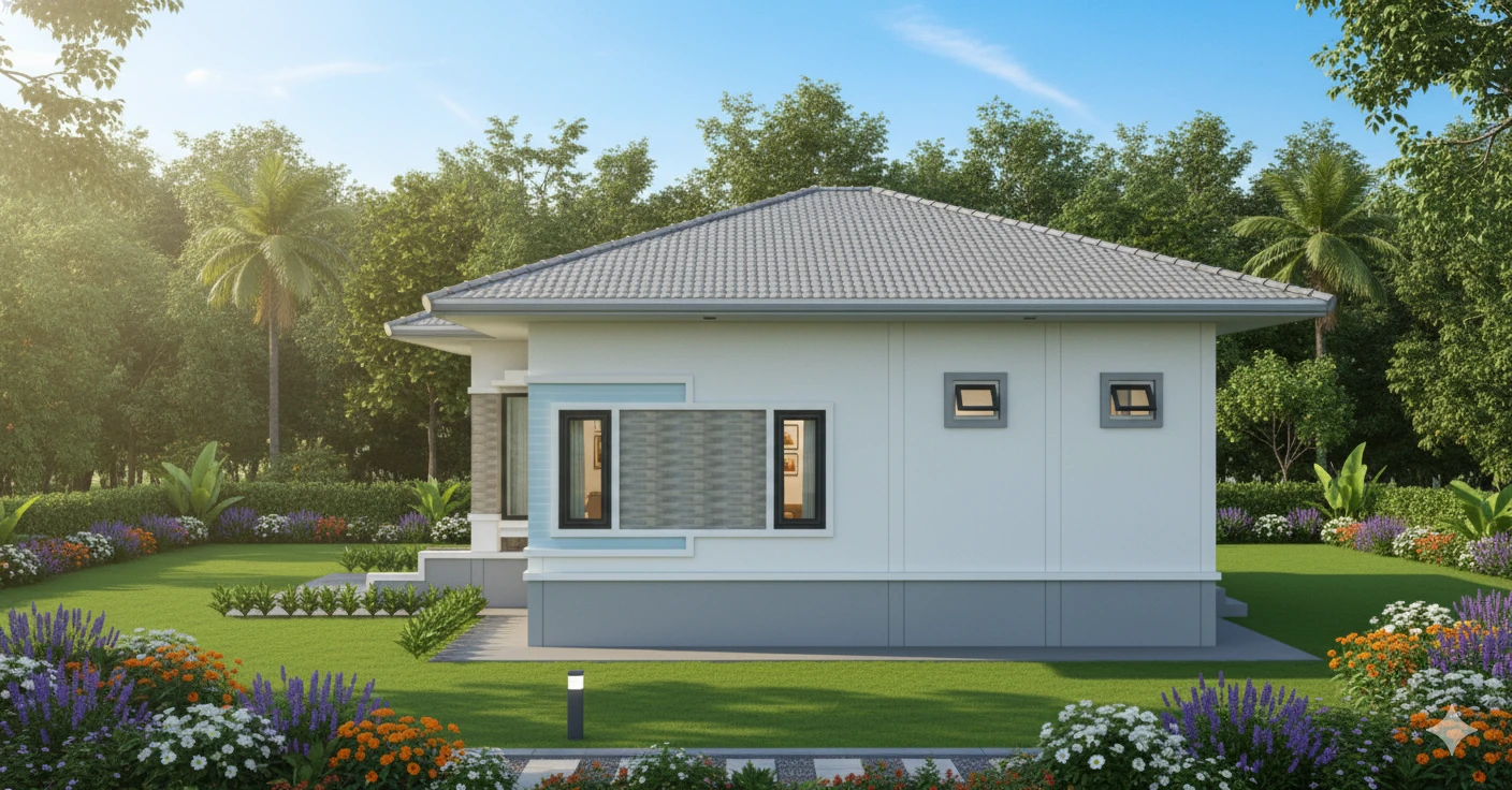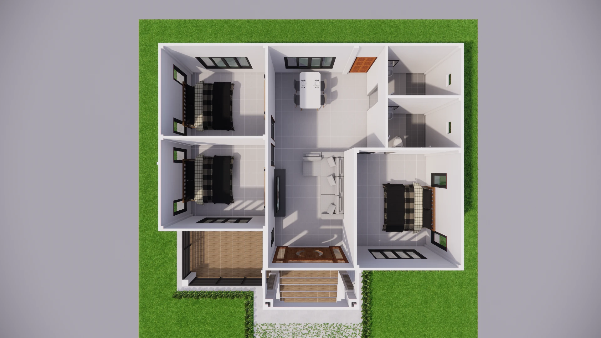 แบบบ้านปั้นหยาชั้นเดียว สไตล์โมเดิร์นร่วมสมัย โดยแบ่งเป็น 3 ห้องนอน 2 ห้องน้ำ 1 ห้องนั่งเล่น 1 ห้องรับประทานอาหาร