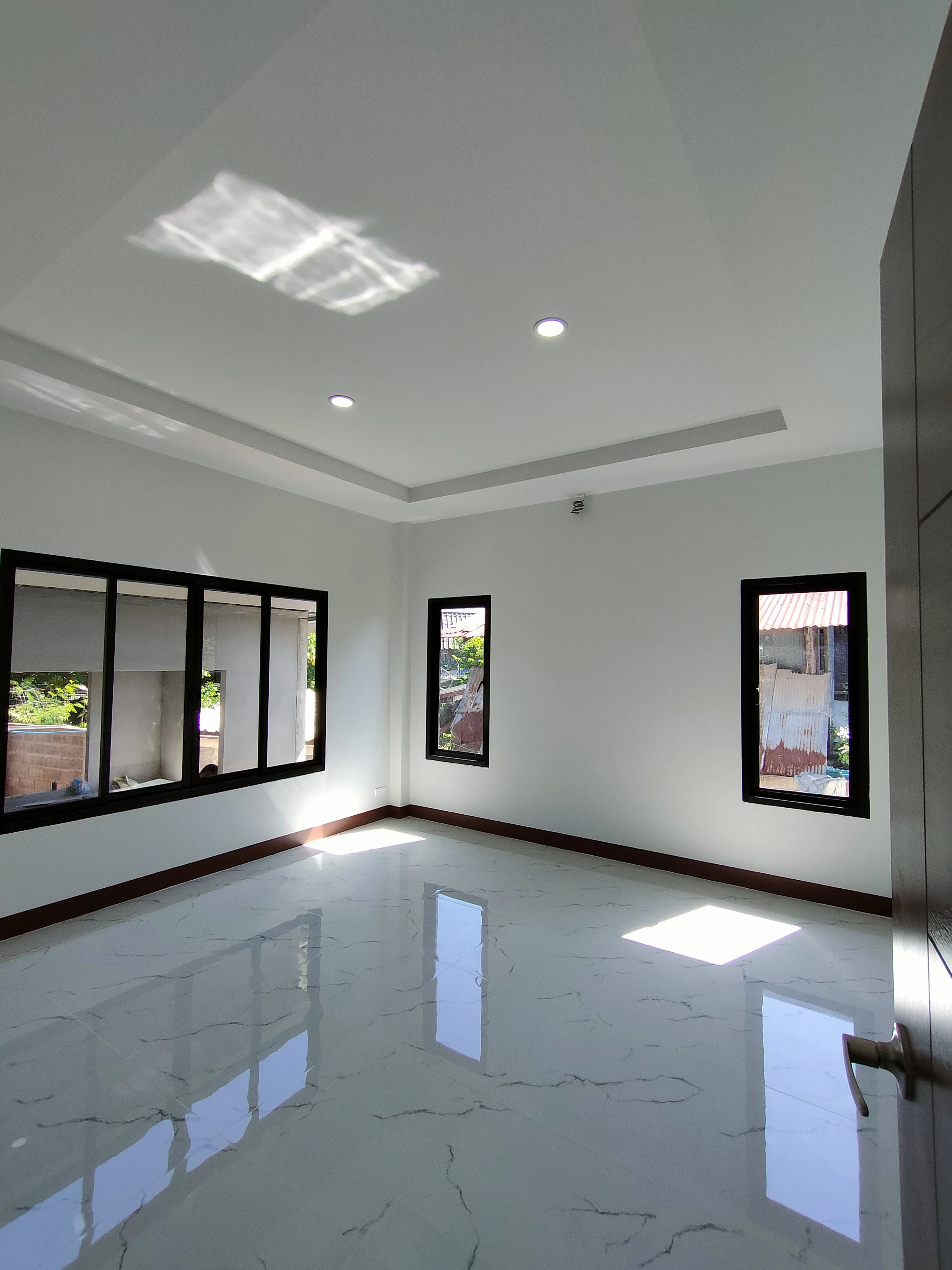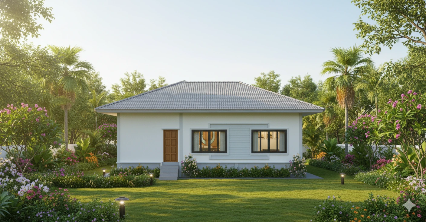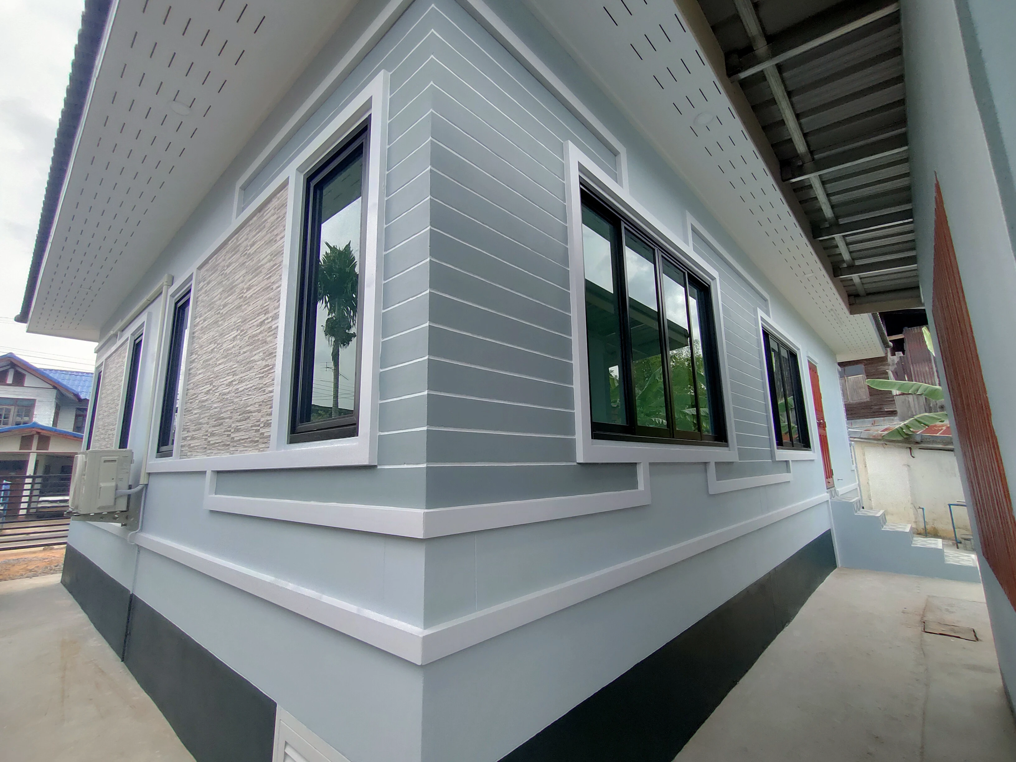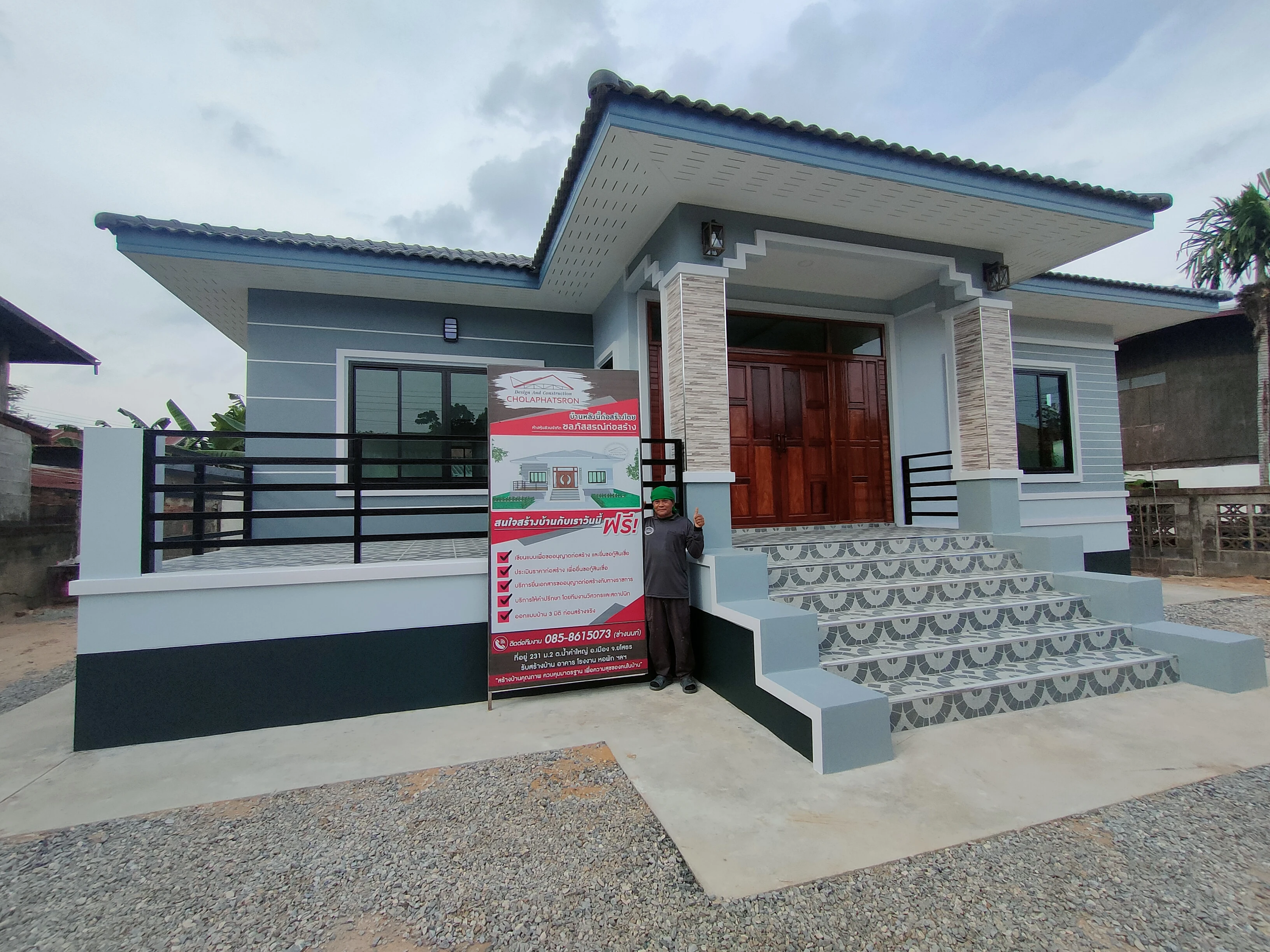 แบบบ้านปั้นหยาชั้นเดียว สไตล์โมเดิร์นร่วมสมัย โดยแบ่งเป็น 3 ห้องนอน 2 ห้องน้ำ 1 ห้องนั่งเล่น 1 ห้องรับประทานอาหาร