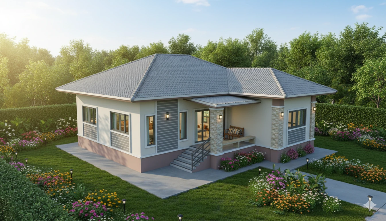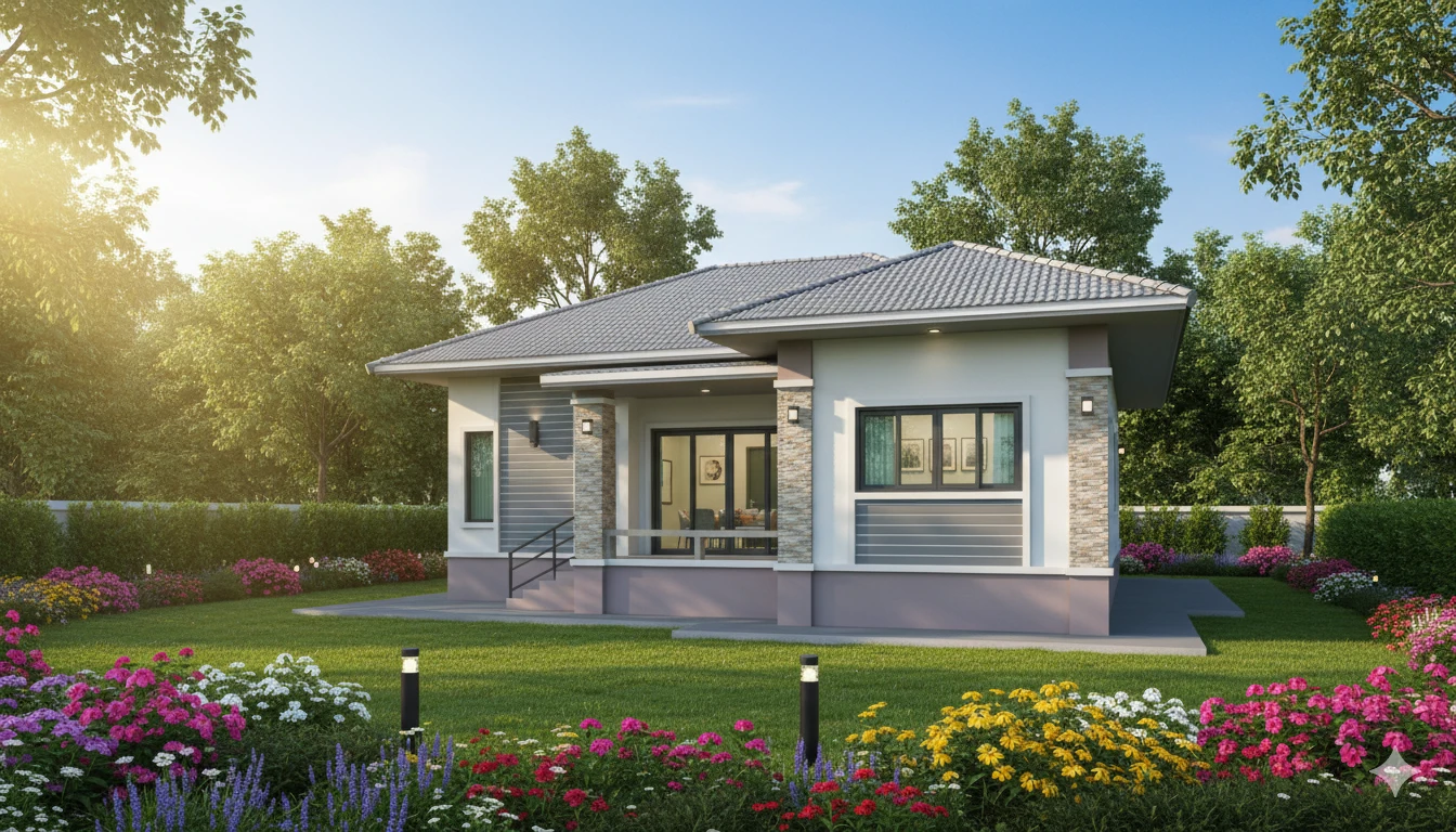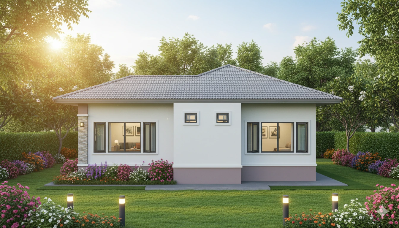 บ้านปั้นหยาสไตล์โมเดิร์นร่วมสมัย พื้นที่ใช้สอย 120 ตร.ม. โดยแบ่งเป็น 3 ห้องนอน 2 ห้องน้ำ 1 ห้องนั่งเล่น 1 ห้องครัว 1 ระเบียง