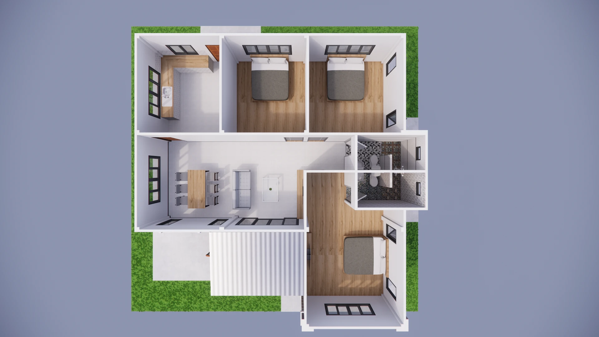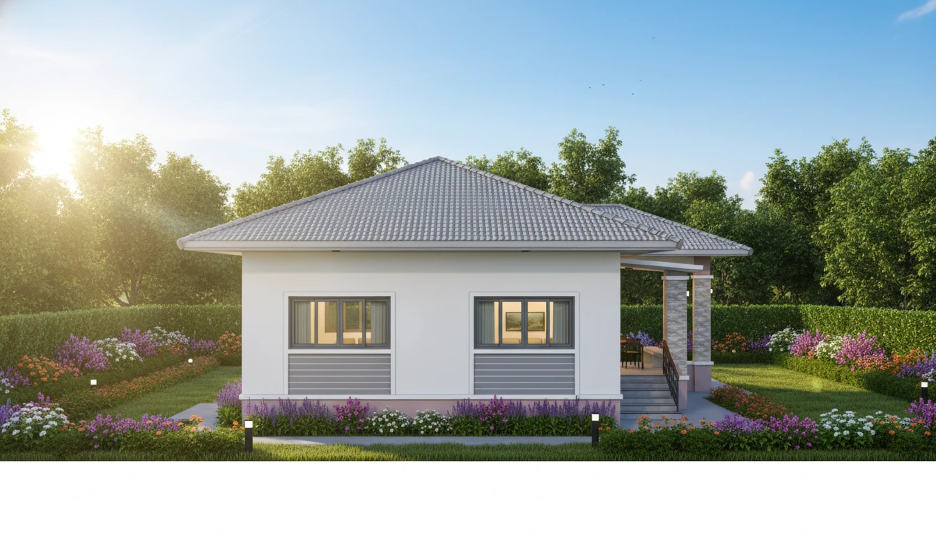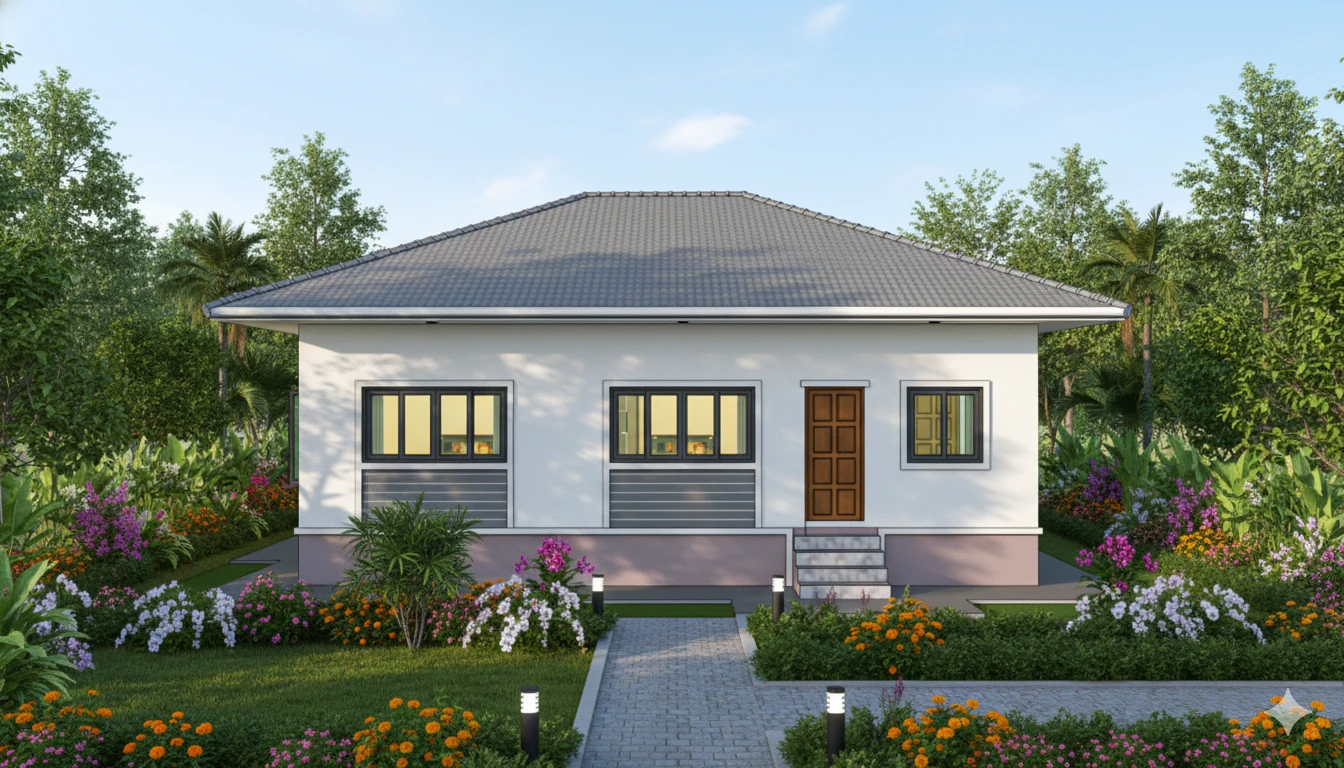 บ้านปั้นหยาสไตล์โมเดิร์นร่วมสมัย พื้นที่ใช้สอย 120 ตร.ม. โดยแบ่งเป็น 3 ห้องนอน 2 ห้องน้ำ 1 ห้องนั่งเล่น 1 ห้องครัว 1 ระเบียง