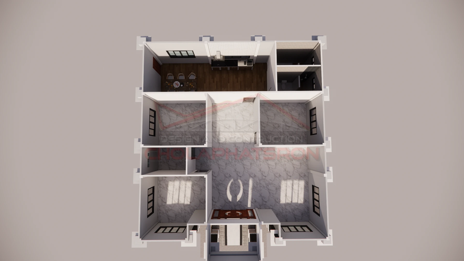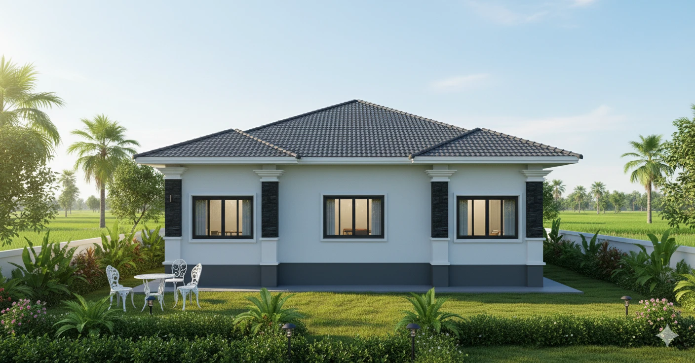 บ้านปั้นหยาที่มีพื้นที่ภายในกว้างขวาง เหมาะสำหรับครอบครัวใหญ่ โดยแบ่งเป็น 3ห้องนอน 1 ห้องแต่งตัว 2 ห้องน้ำ 1 ห้องครัว 1 ห้องโถงที่กว้างใหญ่ รองรับแขกที่มาบ้านได้มากมาย หรือจะเป็นพื้นที่พักผ่อนสำหรับครอบครัวไว้พูดคุยกัน