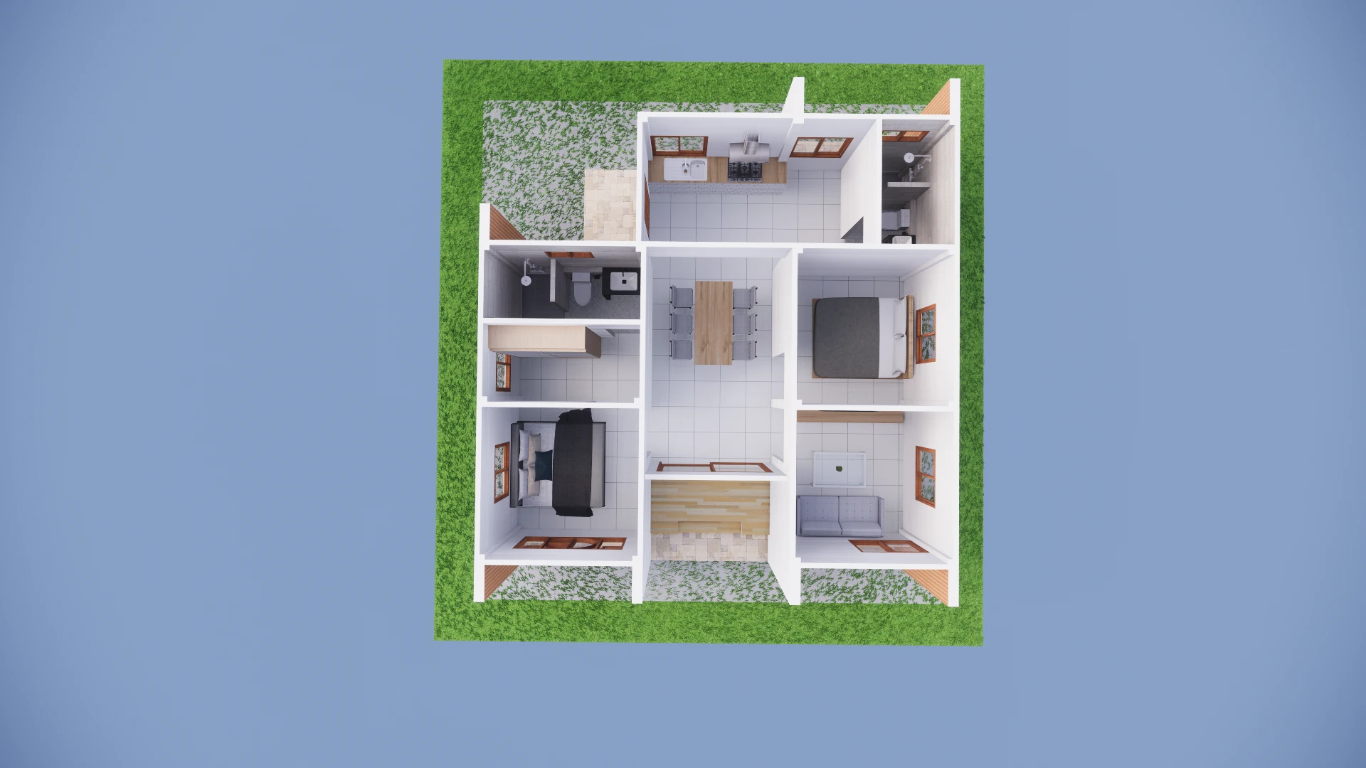 ผลงานการออกแบบบ้านที่มีพื้นที่จำกัด แต่ยังสามารถจัดสรรพื้นที่ได้อย่างลงตัวโดยแบ่งเป็น 2 ห้องนอน 2 ห้องน้ำ 1 ห้องรับประทานอาหาร 1 ห้องนั่งเล่น 1 ห้องแต่งตัว