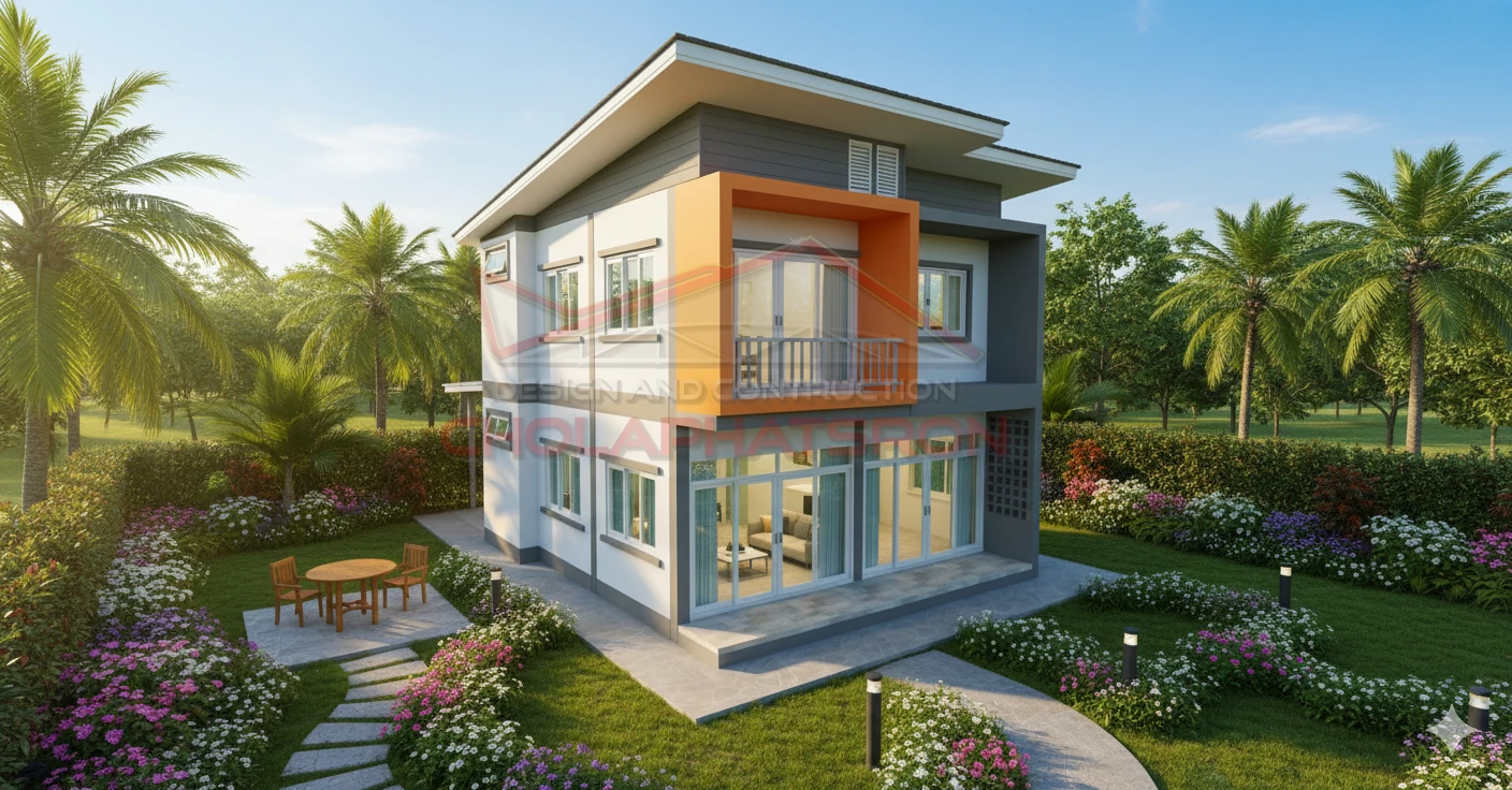 บ้านสองชั้นสไตล์โมเดิร์น พื้นที่ใช้สอย 155 ตร.ม. แบ่งเป็น 3 ห้องนอน 2 ห้องน้ำ 1 ห้องรับแขก 1 ห้องนั่งเล่น 1 ห้องครัว