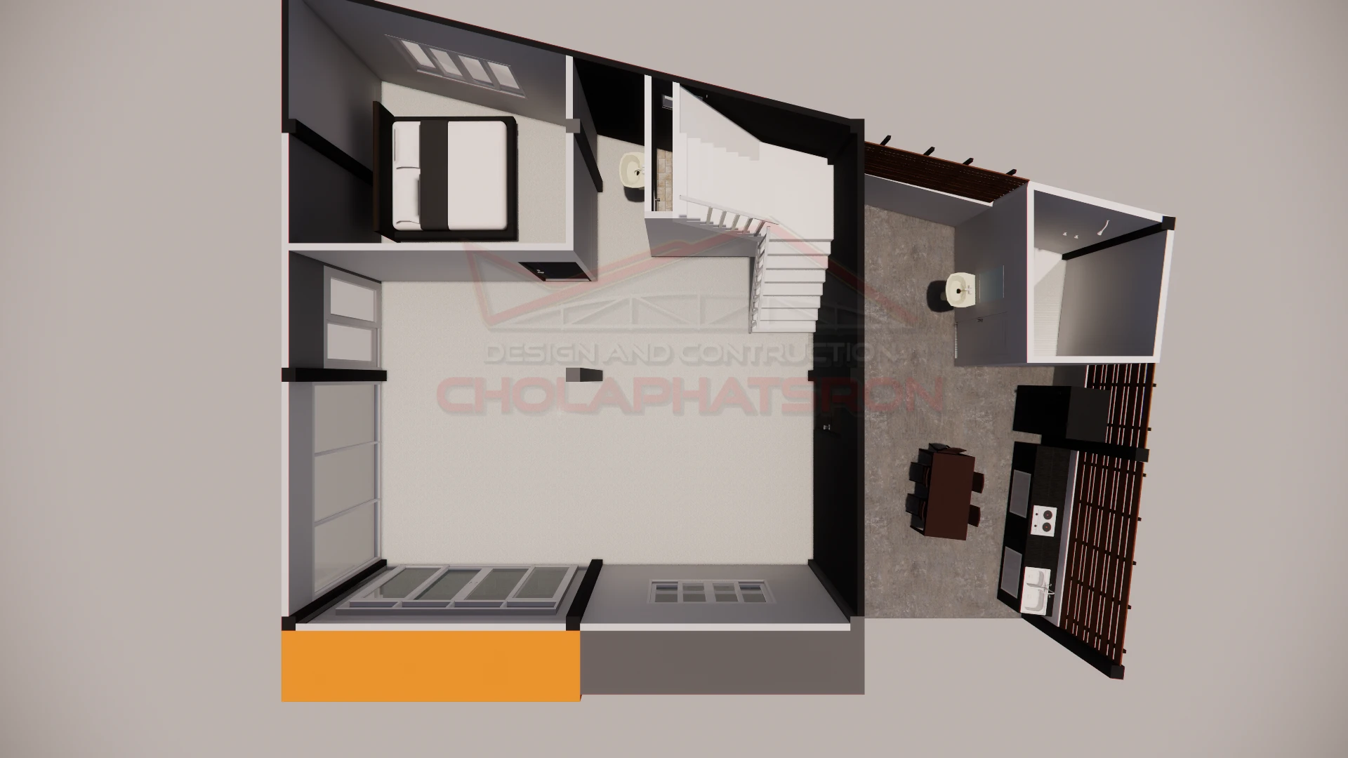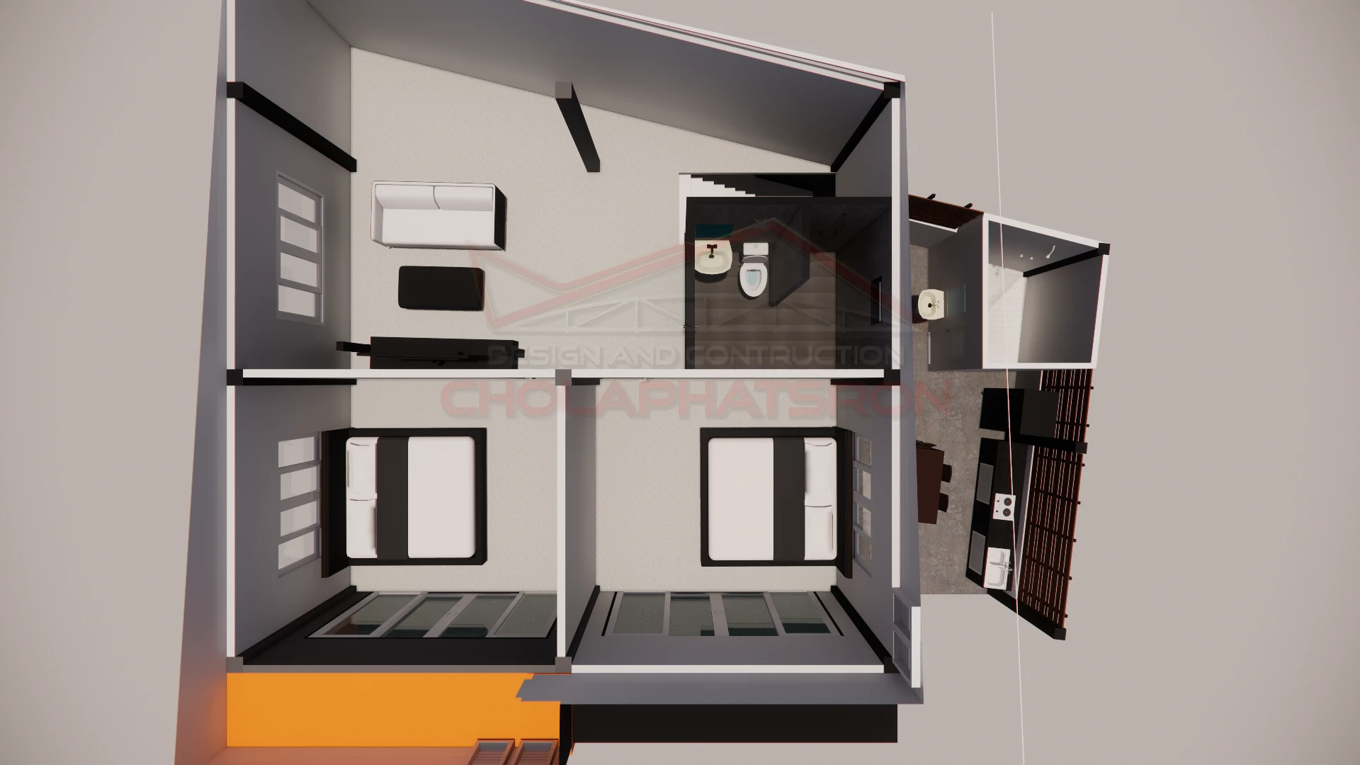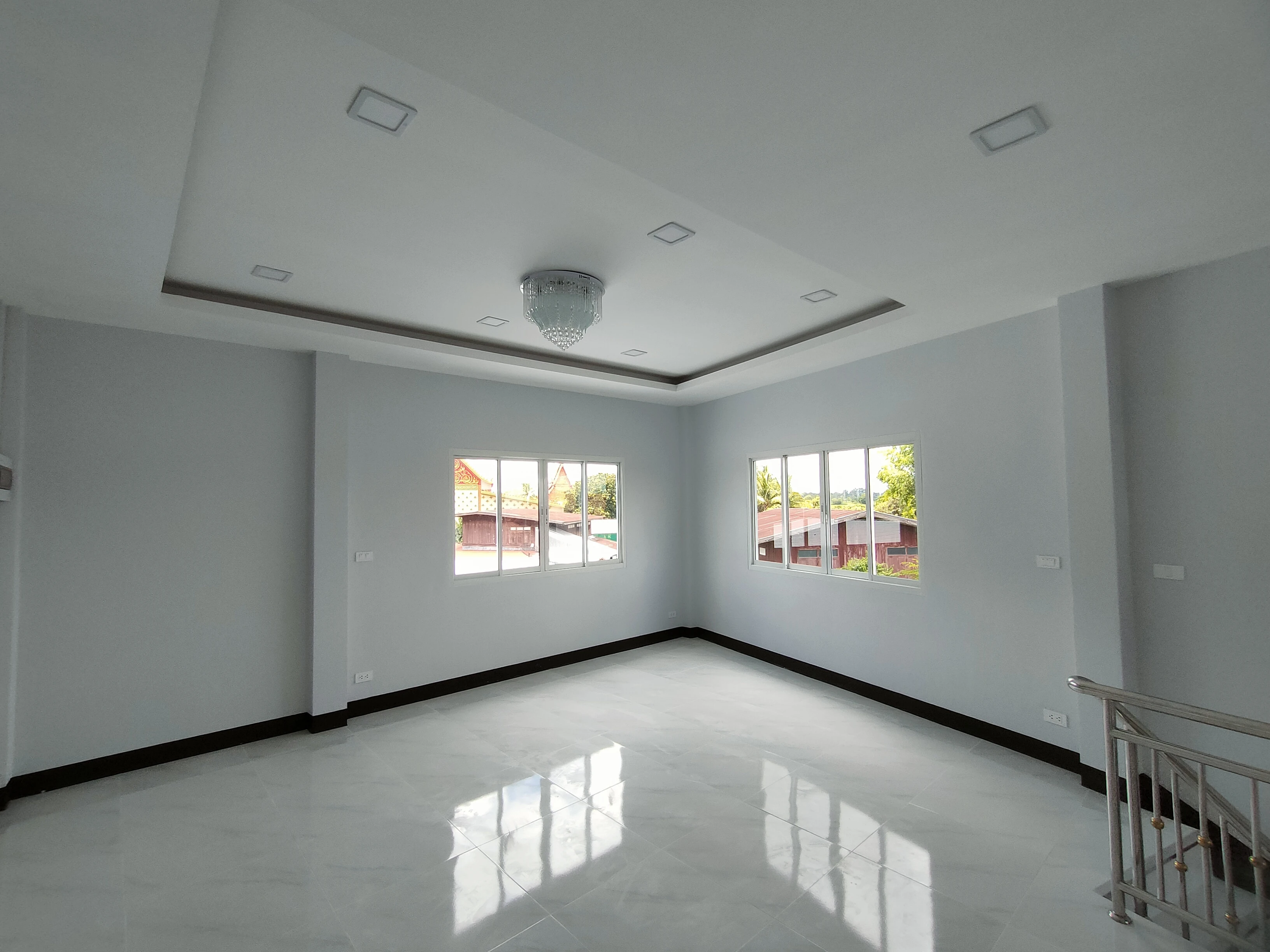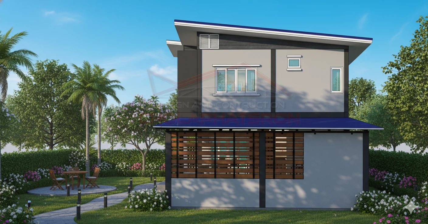 บ้านสองชั้นสไตล์โมเดิร์น พื้นที่ใช้สอย 140 ตร.ม. ที่จัดพื้นที่ห้องโถงด้านล่างเป็นร้านขายของ และมีห้องนอน 1 ห้อง ห้องน้ำ 1 ห้อง และด้านบนแบ่งเป็น 2 ห้องนอน 1 ห้องน้ำ 1 ห้องนั่งเล่น