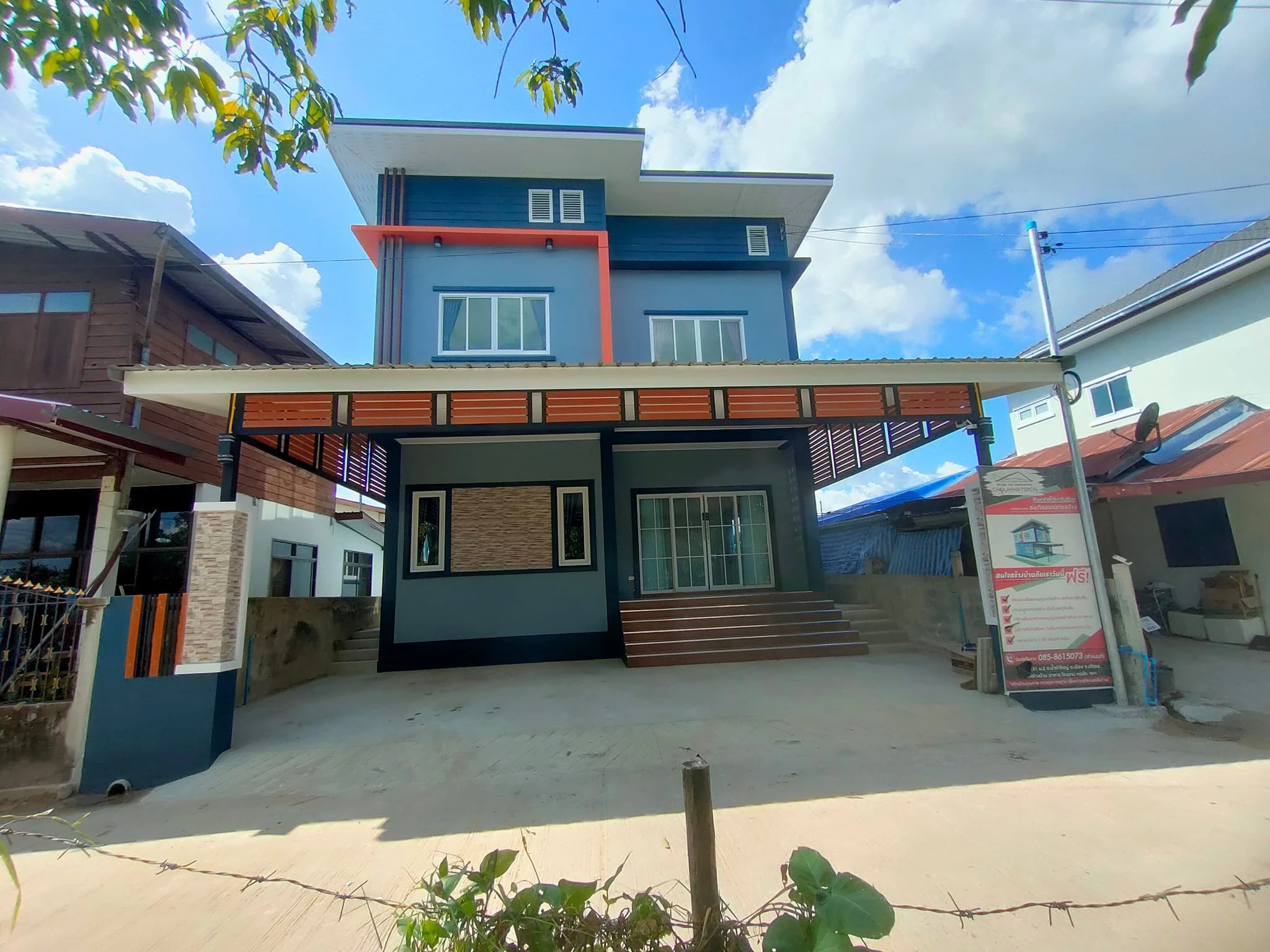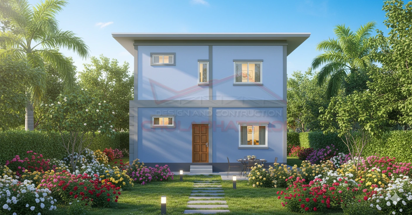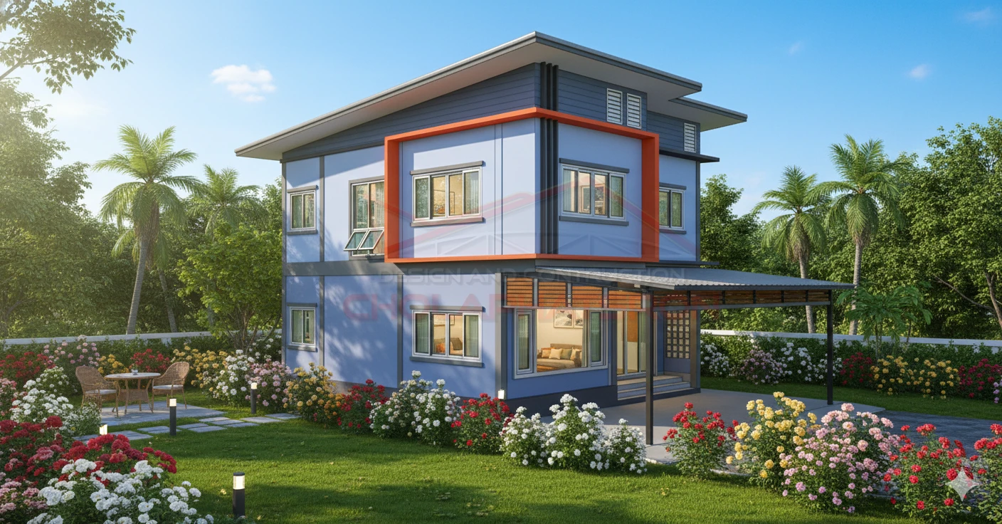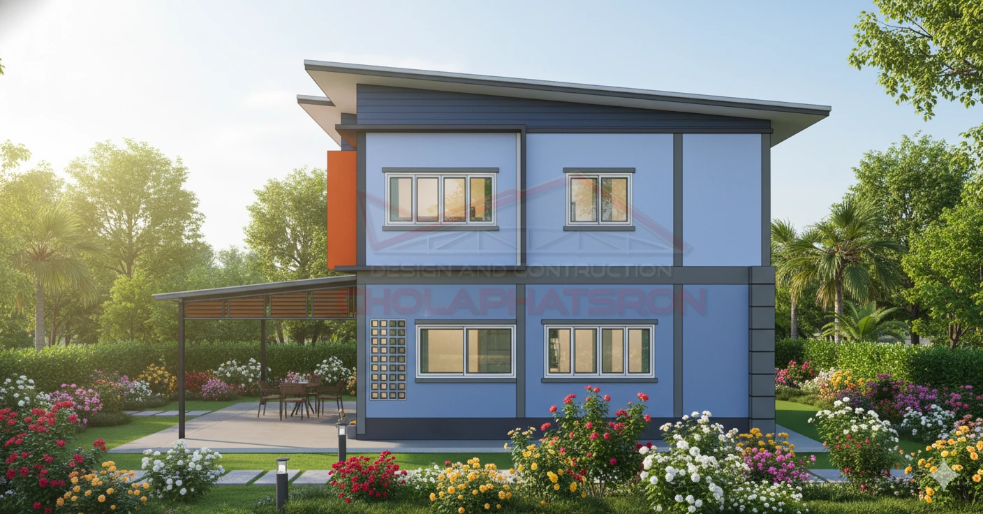 แบบบ้านสองชั้นสไตล์โมเดิร์น แบ่งเป็น 4 ห้องนอน 2 ห้องน้ำ 1 ห้องครัว 1 ห้องรับแขก 1 ที่จอดรถ