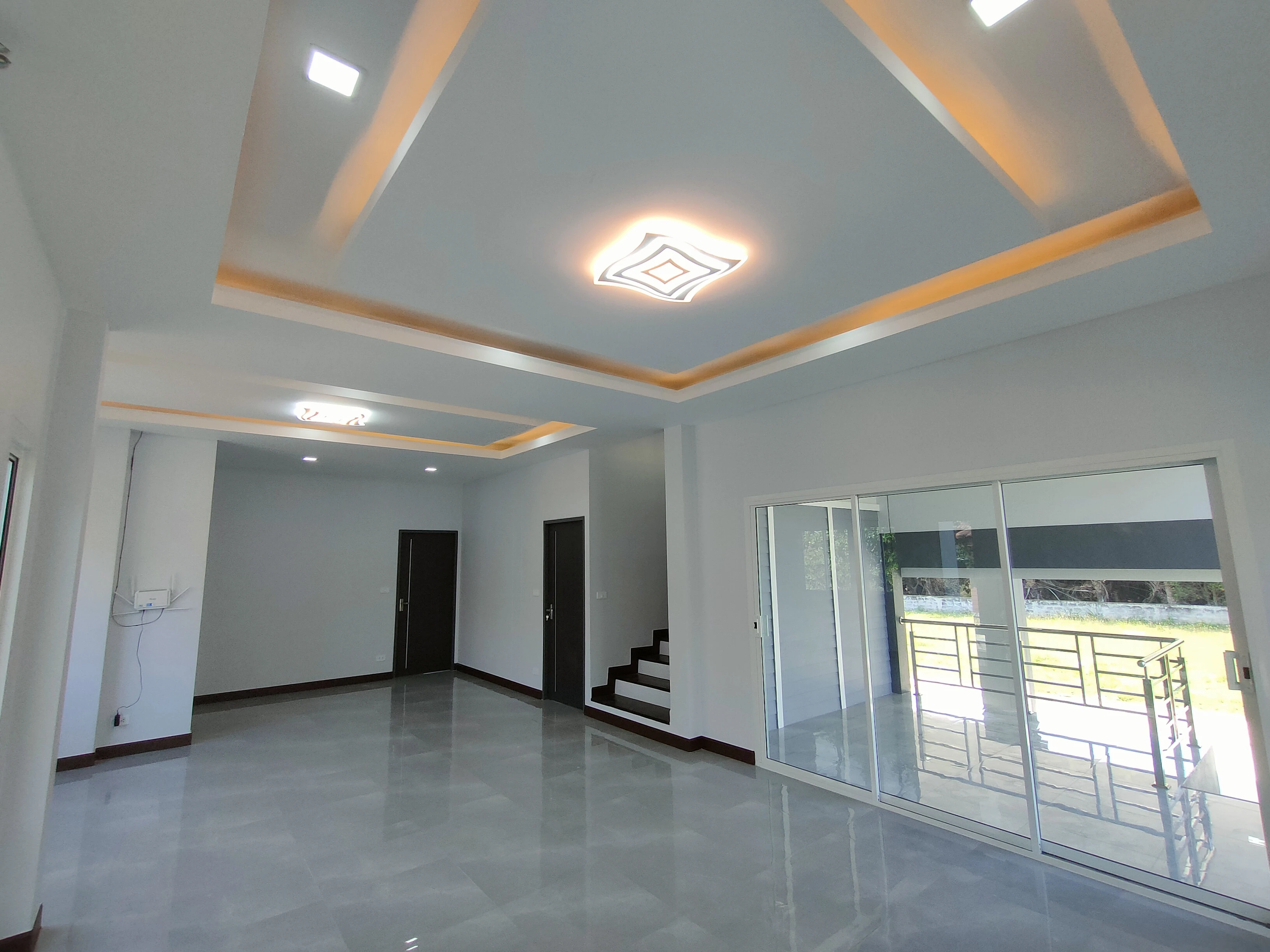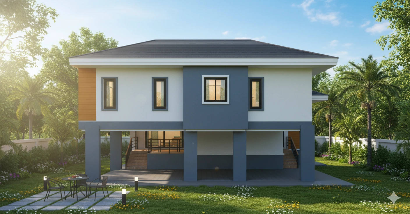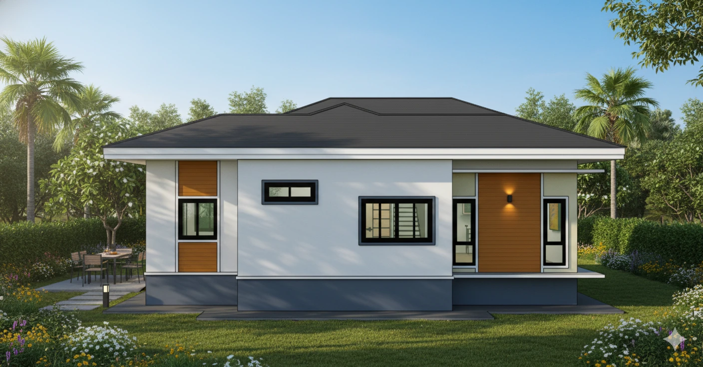 บ้านชั้นครึ่งสไตล์โมเดิร์นร่วมสมัย ที่แบ่งเป็น 2 ห้องนอน 1 ห้องทำงาน 1 ห้องนั่งเล่น 1 ห้องพระ 1 ห้องครัว 1 ห้องน้ำ และสามารถจอดรถได้ 2 คัน