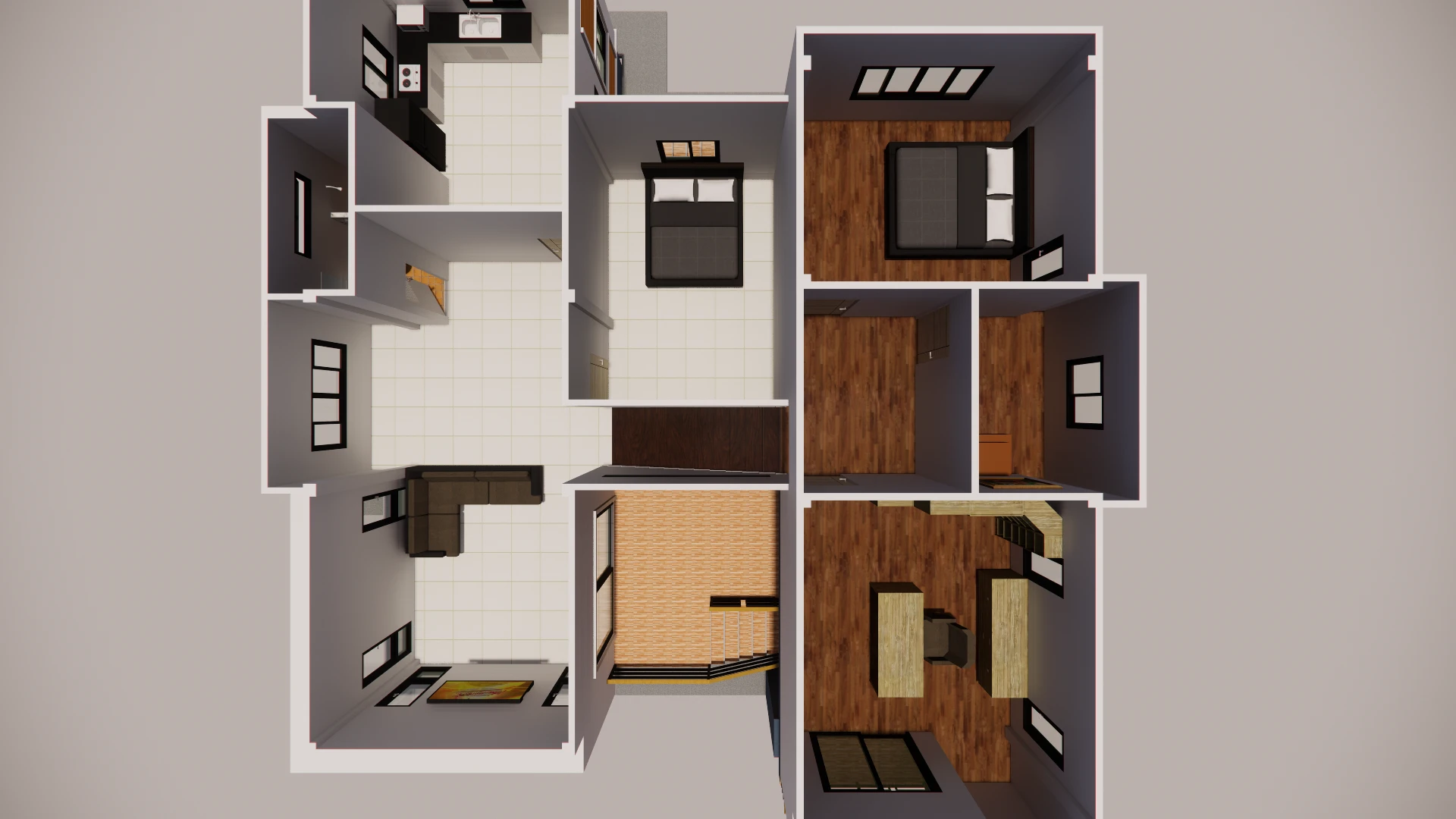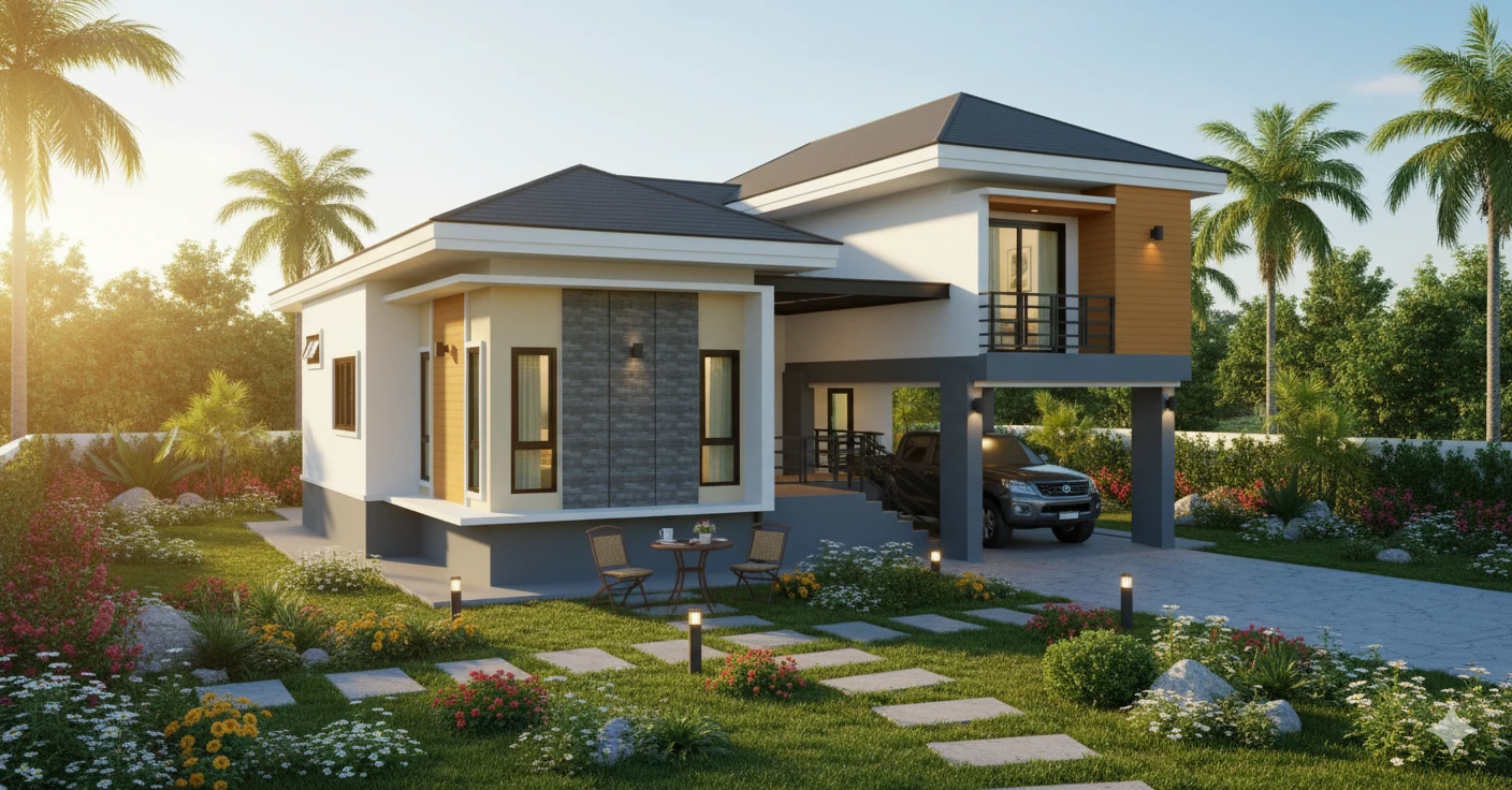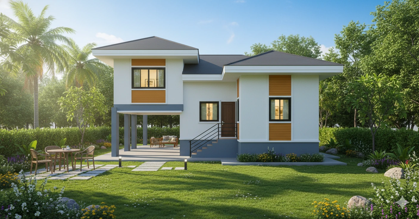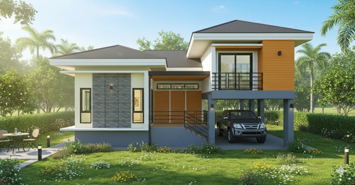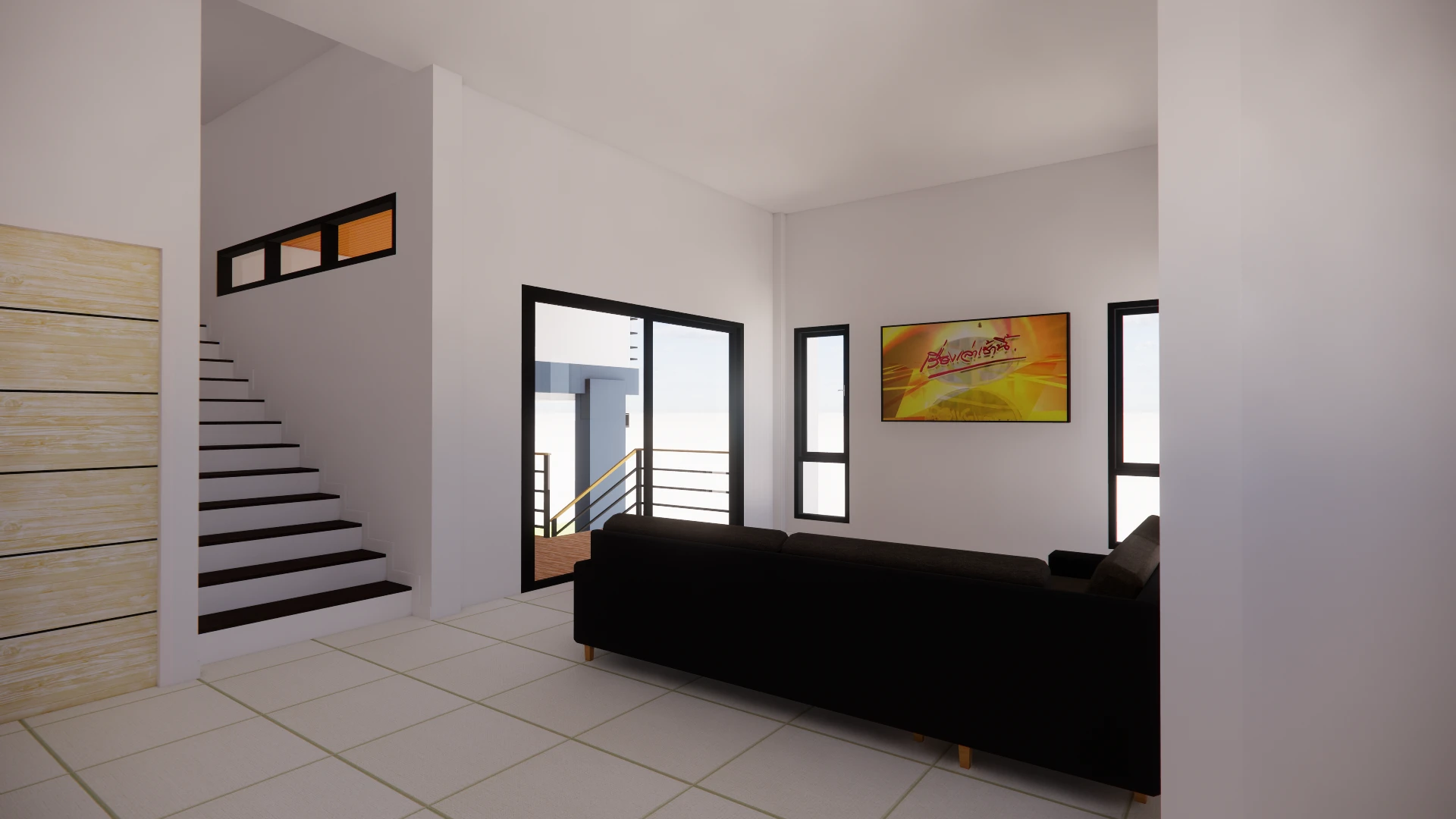 บ้านชั้นครึ่งสไตล์คอนเทมโพรารี่ ที่แบ่งเป็น 2 ห้องนอน 1 ห้องทำงาน 1 ห้องนั่งเล่น 1 ห้องพระ 1 ห้องครัว 1 ห้องน้ำ และสามารถจอดรถได้ 2 คัน