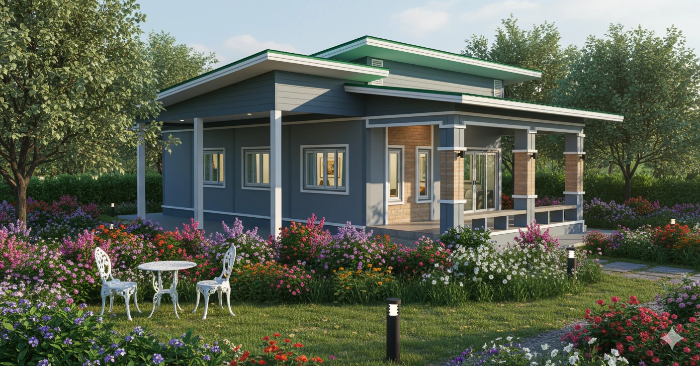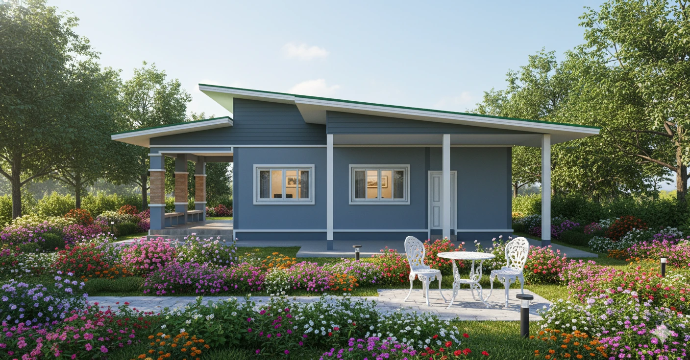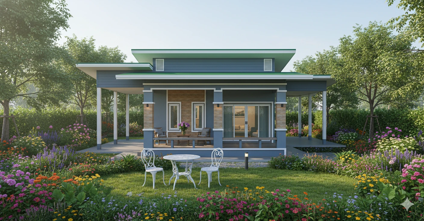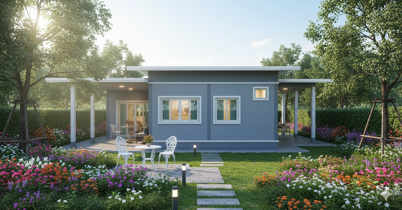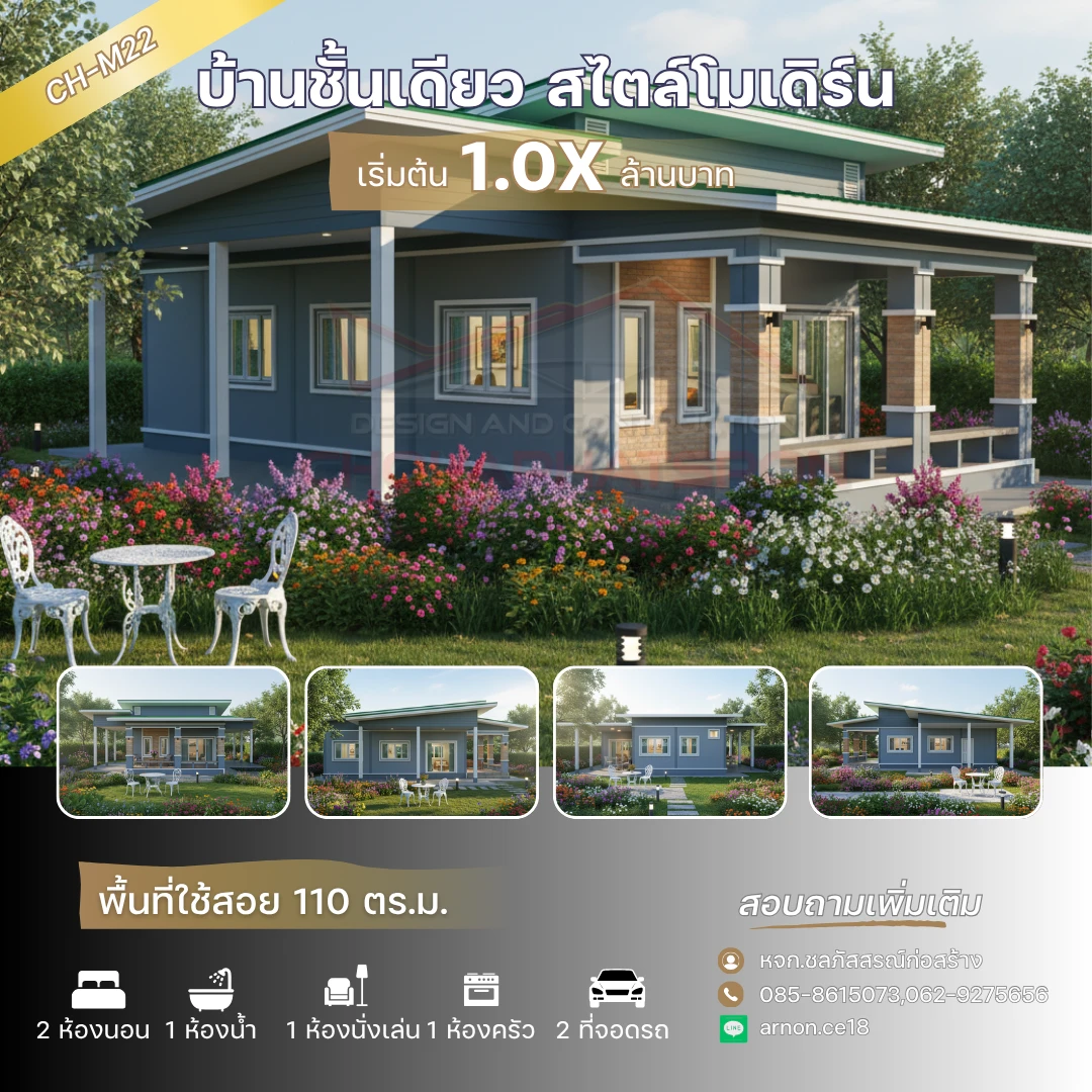 แบบบ้านสไตล์โมเดิร์นชั้นเดียว พื้นที่ใช้สอย 90 ตร.ม. โดยแบ่งเป็น 2 ห้องนอน 1 ห้องน้ำ 1 ห้องครัว 1 ห้องนั่งเล่น และพื้นที่จอดรถด้านข้าง
