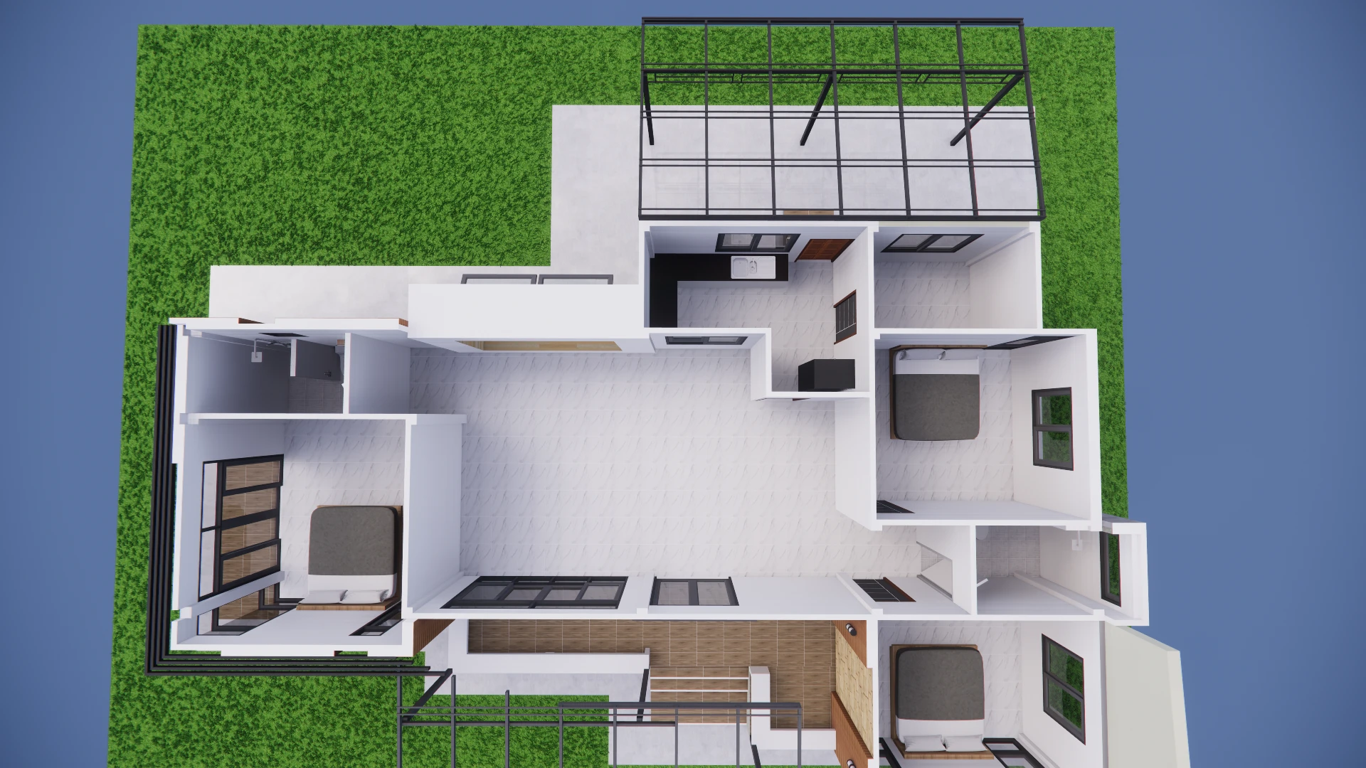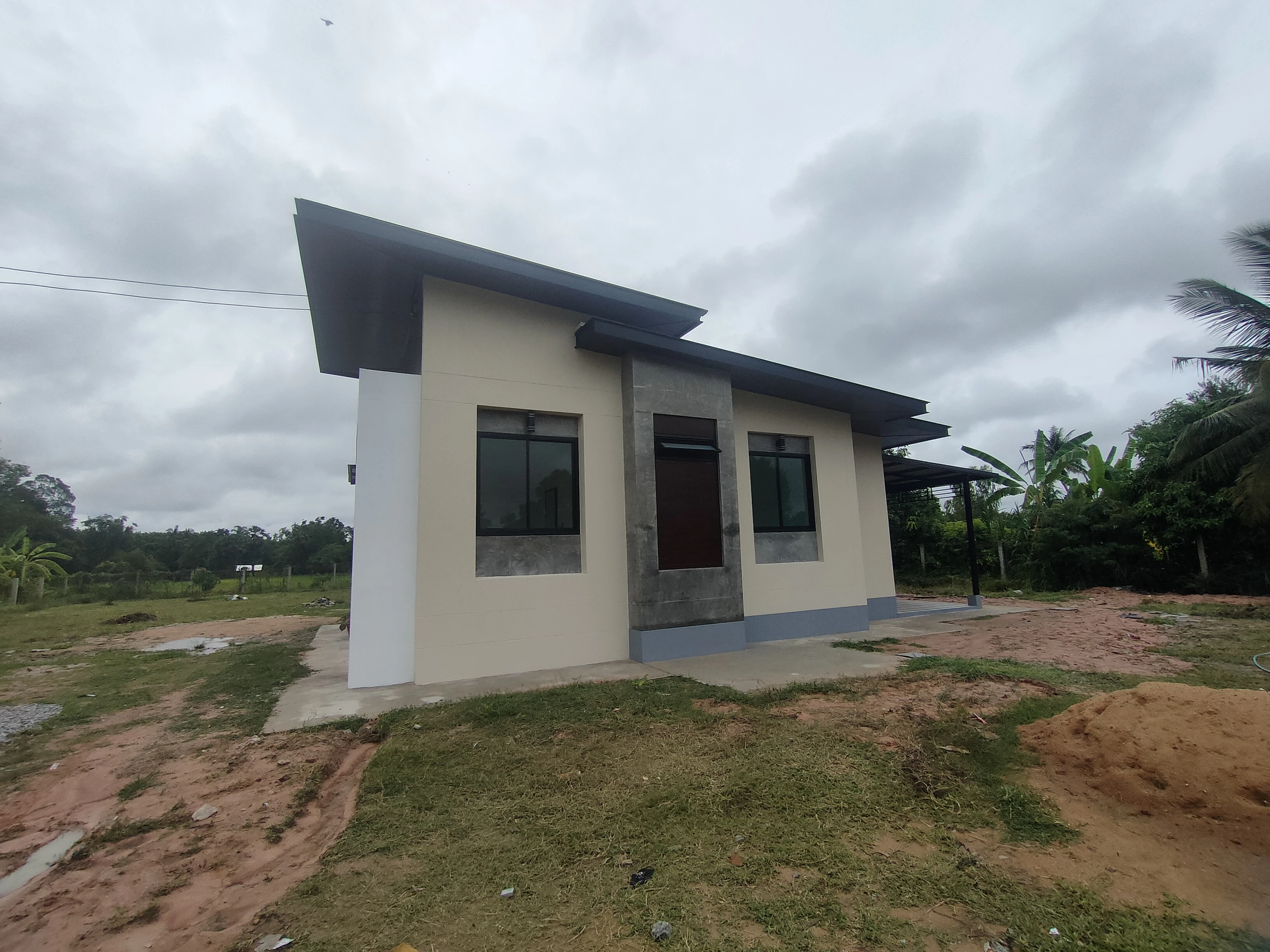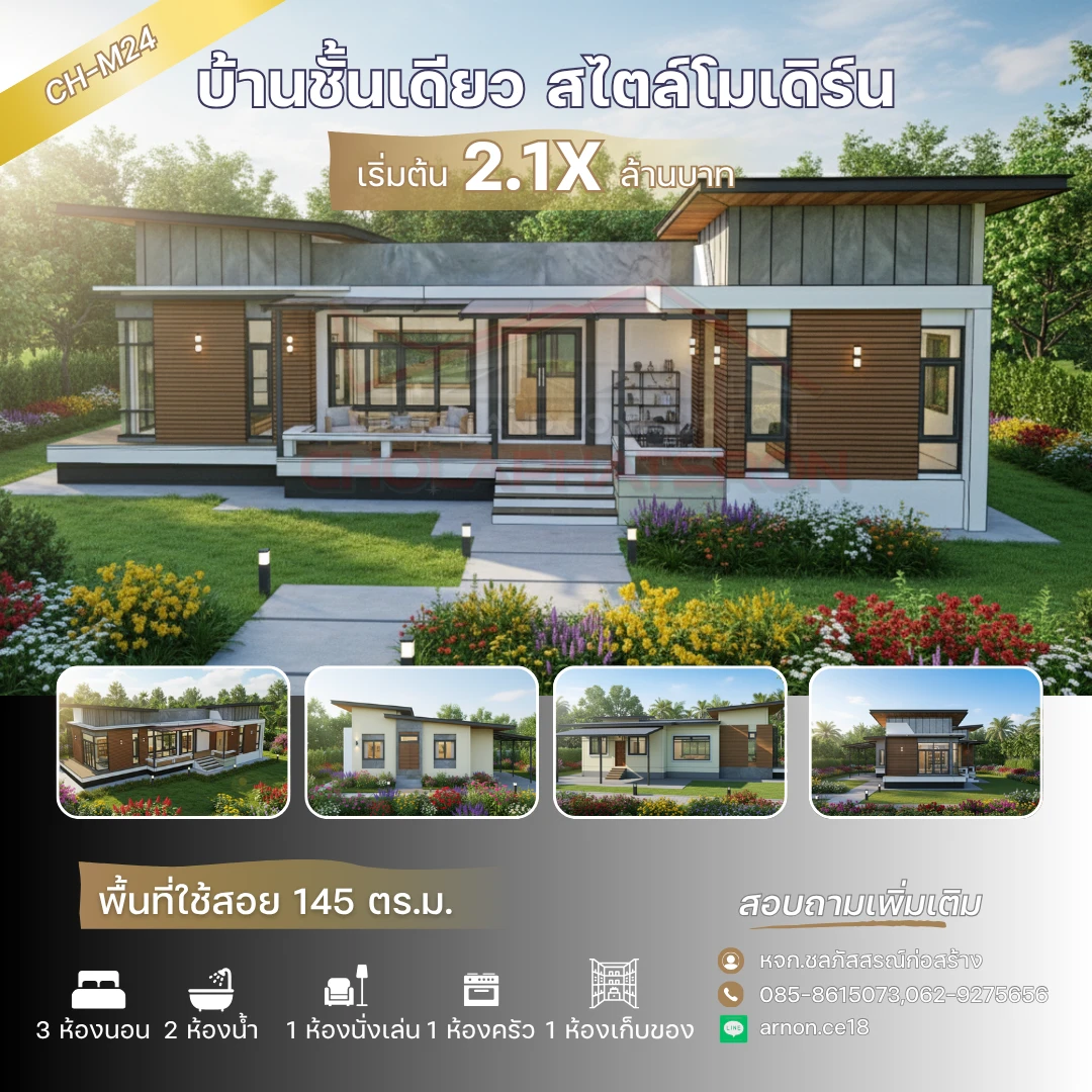 แบบบ้านชั้นเดียวสไตล์โมเดิร์นร่วมสมัย พื้นที่ใช้สอย 145 ตร.ม.โดยแบ่งเป็น 3 ห้องนอน 2 ห้องน้ำ 1 ห้องนั่งเล่น 1 ห้องครัว 1 ห้องเก็บของ มีมุมนั่งชมวิวด้านหลัง