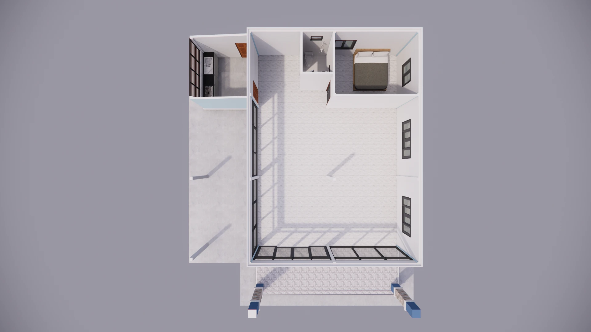 แบบบ้านสไตล์โมเดิร์น โดยจัดพื้นที่มีห้องโถงใหญ่เพื่อเป็นร้านค้า โดยแบ่งเป็น 1 ห้องนอน 1 ห้องน้ำ 1 ห้องครัว