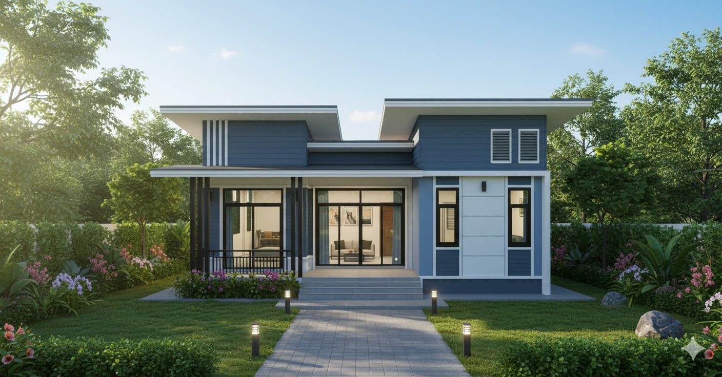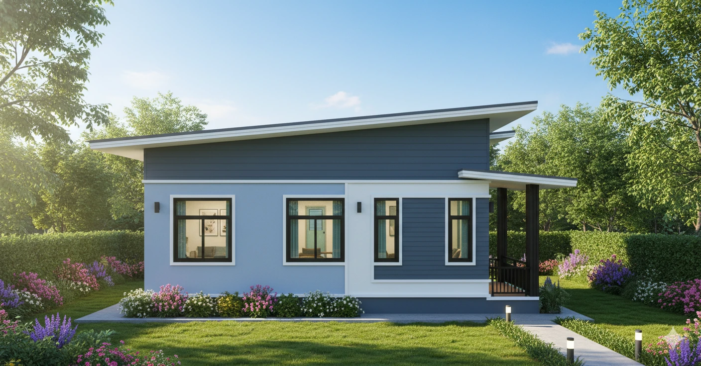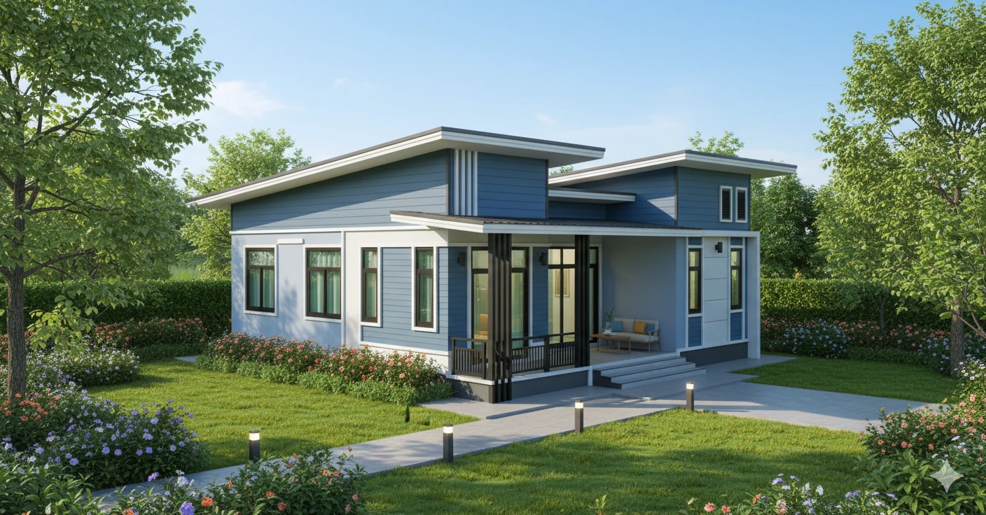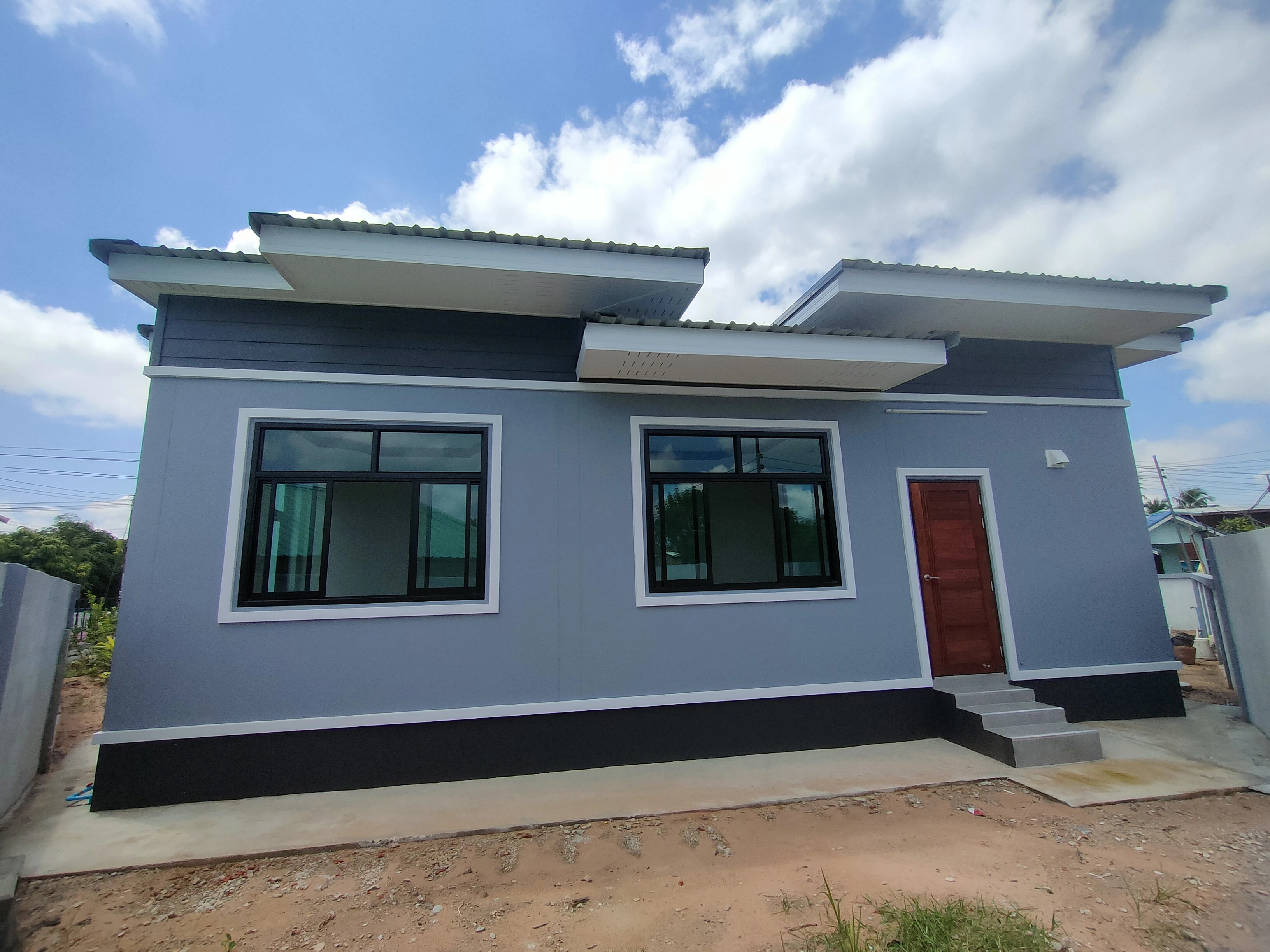 แบบบ้านชั้นเดียวสไตล์โมเดิร์น โดยแบ่งเป็น 3 ห้องนอน 2 ห้องน้ำ 1 ห้องนั่งเล่น 1 ห้องรับประทานอาหาร