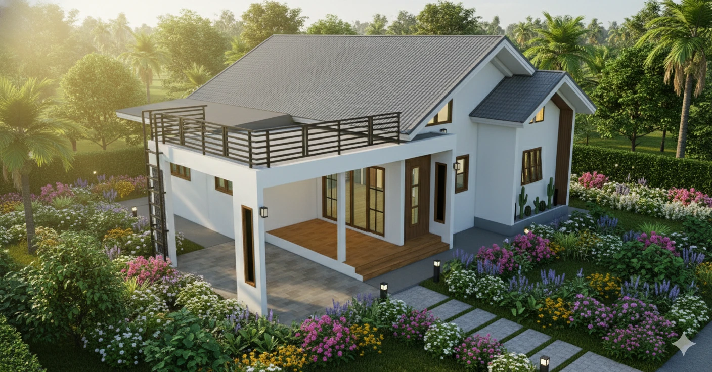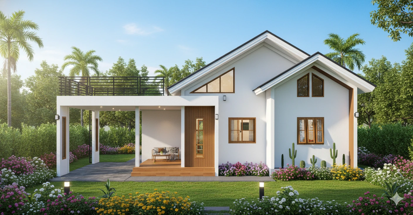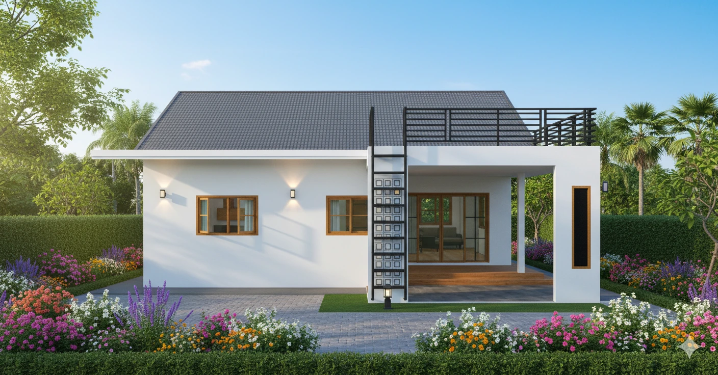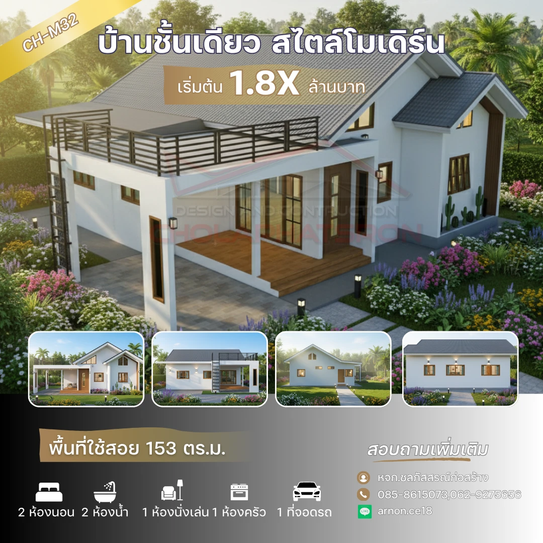แบบบ้านชั้นเดียวสไตล์โมเดิร์น พื้นที่ใช้สอย 153 ตร.ม. โดยมีดาดฟ้าไว้นั่งรับลมยามเย็น โดยแบ่งเป็น 2 ห้องนอน 1 ห้องเก็บของ 2 ห้องน้ำ 1 ห้องรับแขก 1 ห้องนั่งเล่น 1 ห้องครัว