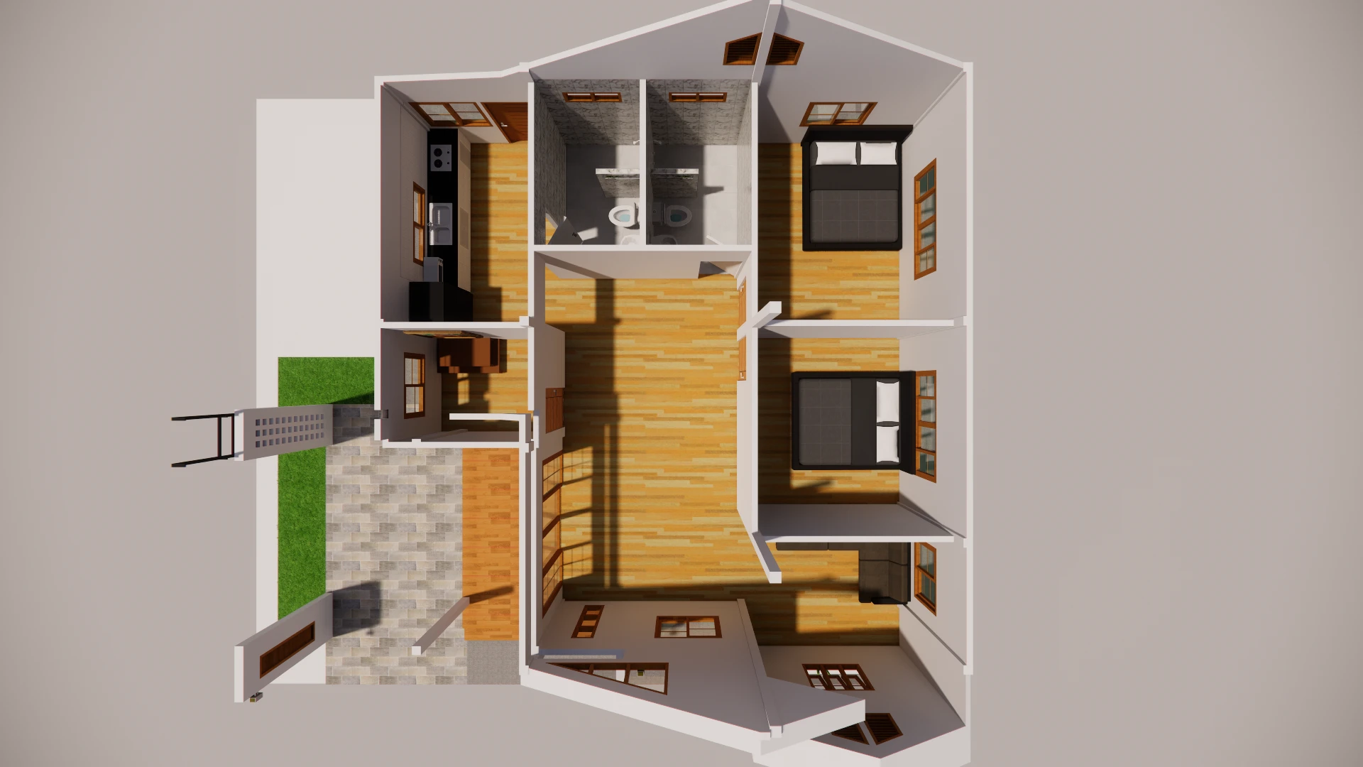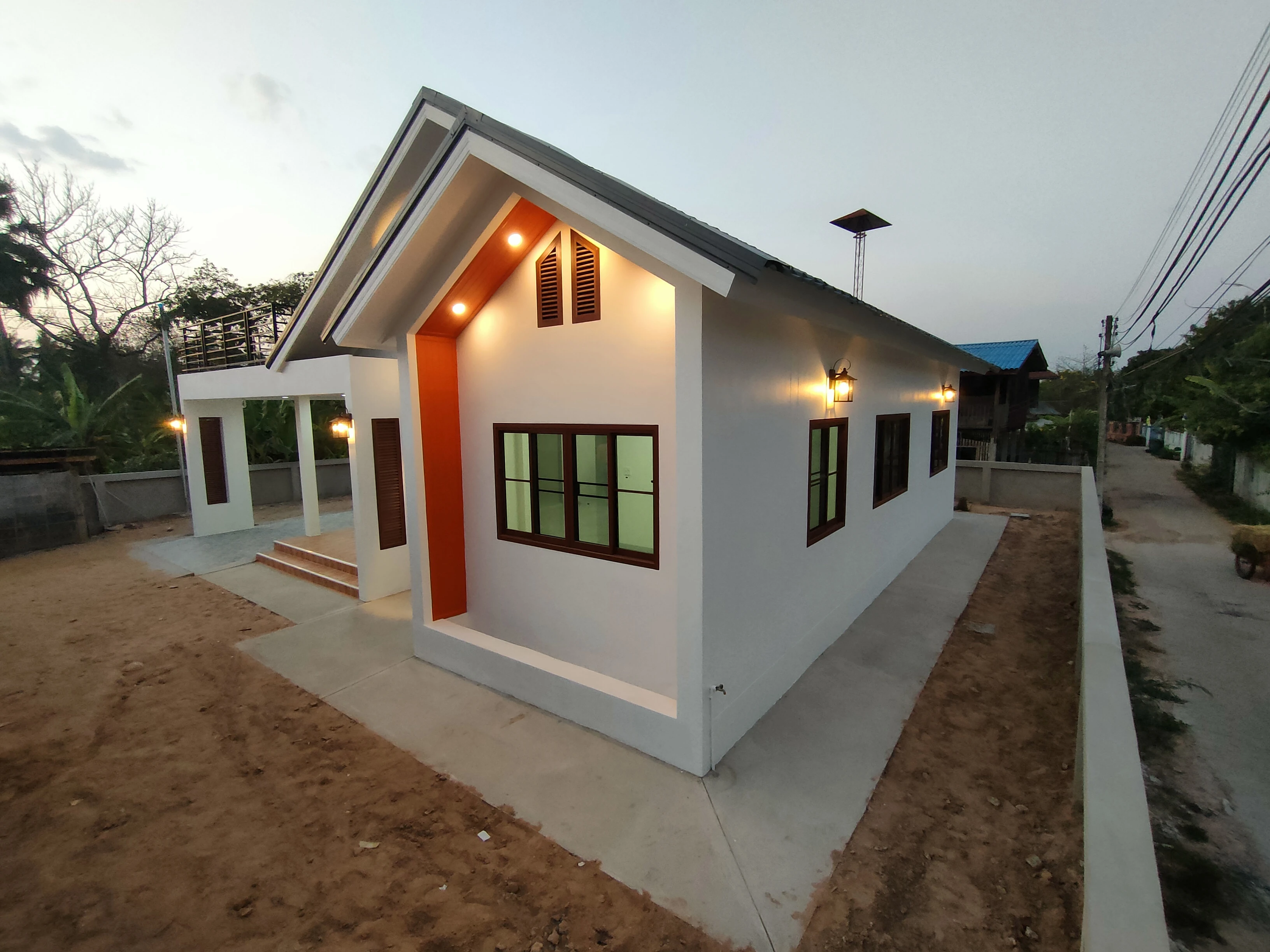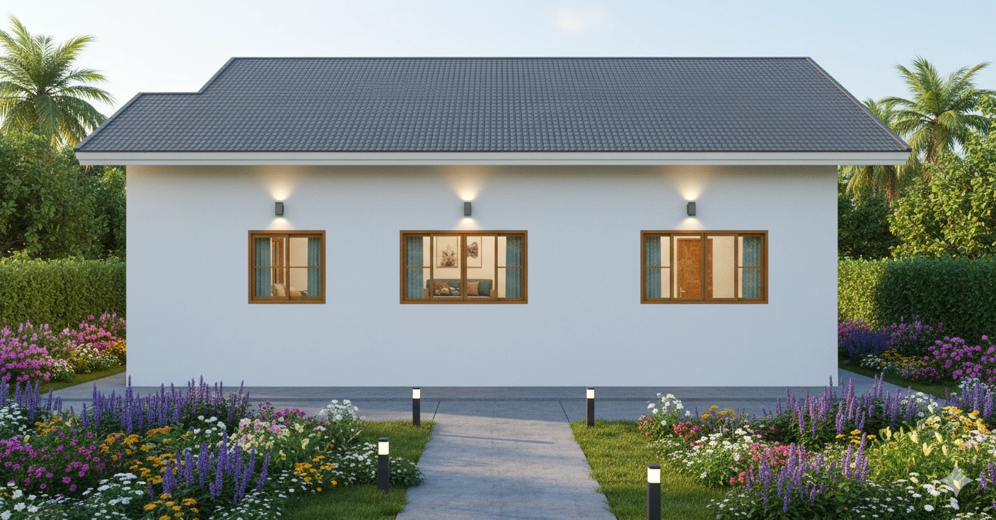แบบบ้านชั้นเดียวสไตล์โมเดิร์น พื้นที่ใช้สอย 153 ตร.ม. โดยมีดาดฟ้าไว้นั่งรับลมยามเย็น โดยแบ่งเป็น 2 ห้องนอน 1 ห้องเก็บของ 2 ห้องน้ำ 1 ห้องรับแขก 1 ห้องนั่งเล่น 1 ห้องครัว