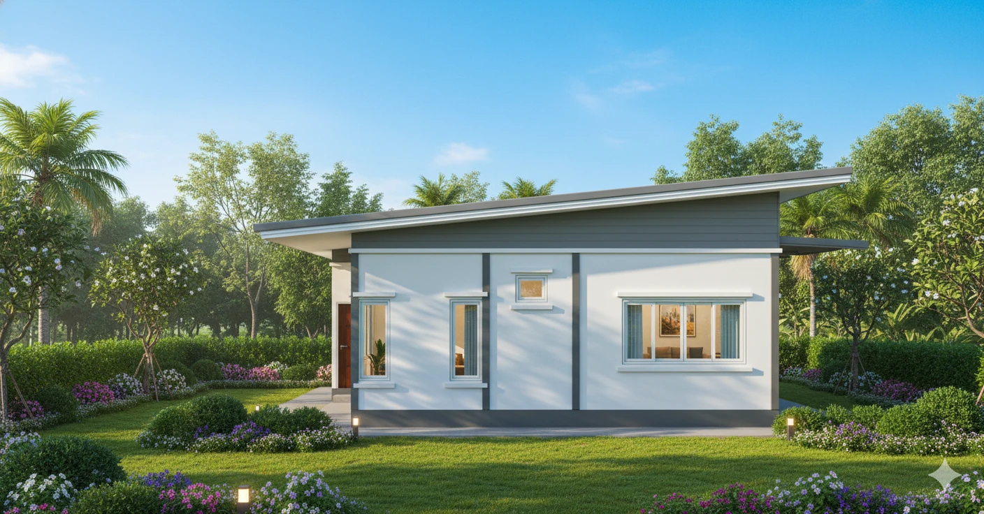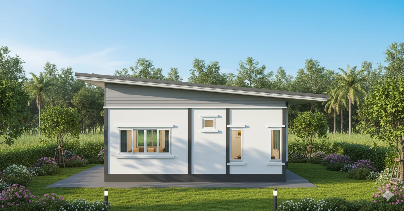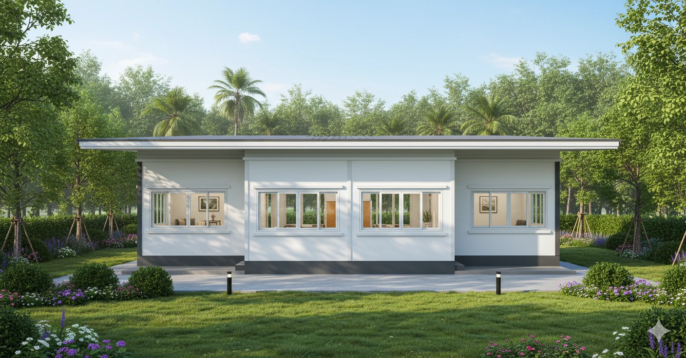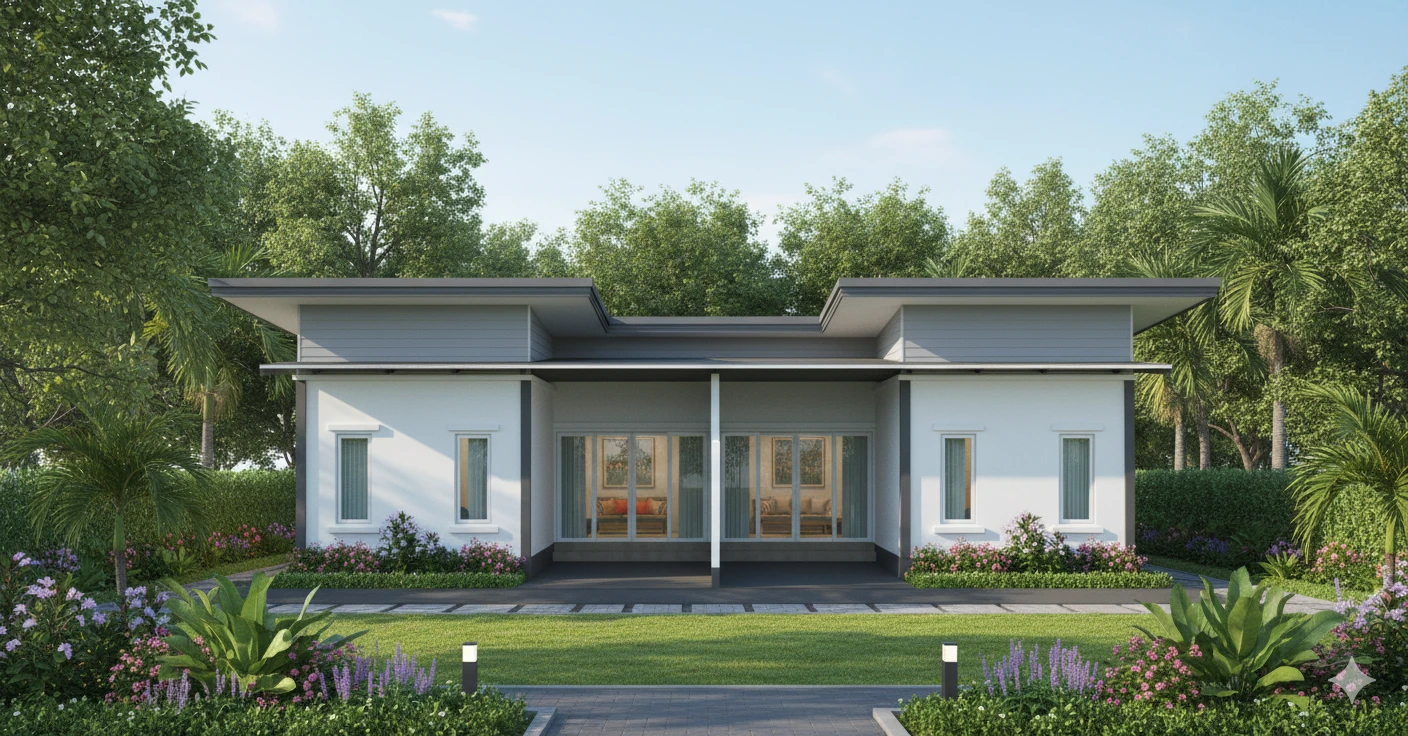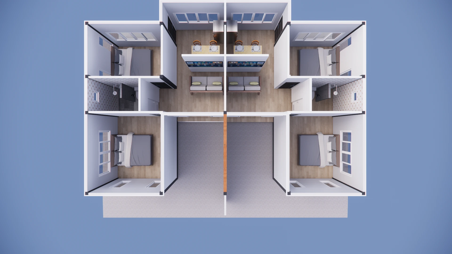 แบบบ้านแฝดสไตล์โมเดิร์น พื้นที่ใช้สอย 120 ตร.ม. โดยแบ่งเป็น 4 ห้องนอน 2 ห้องน้ำ 2 ห้องครัว 2 ห้องนั่งเล่น 2 ที่จอดรถ