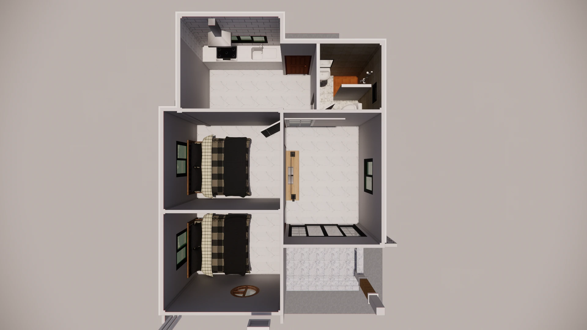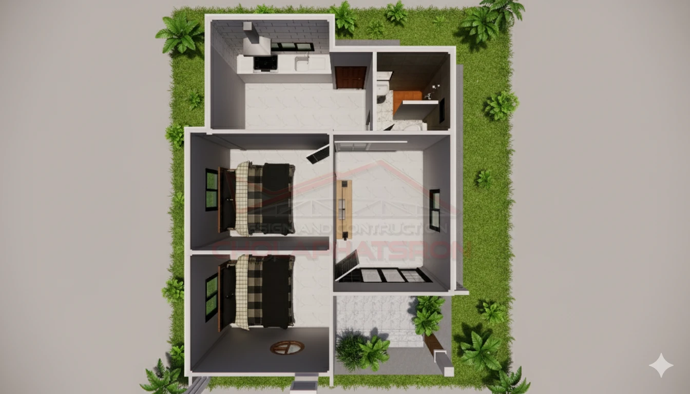 พื้นที่ใช้สอย 60 ตร.ม. 2 ห้องนอน 1 ห้องโถง 1 ห้องครัว 1 ห้องน้ำ