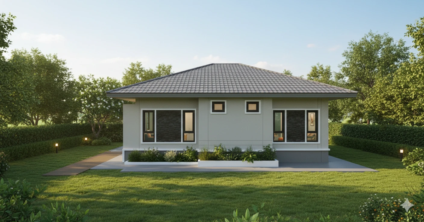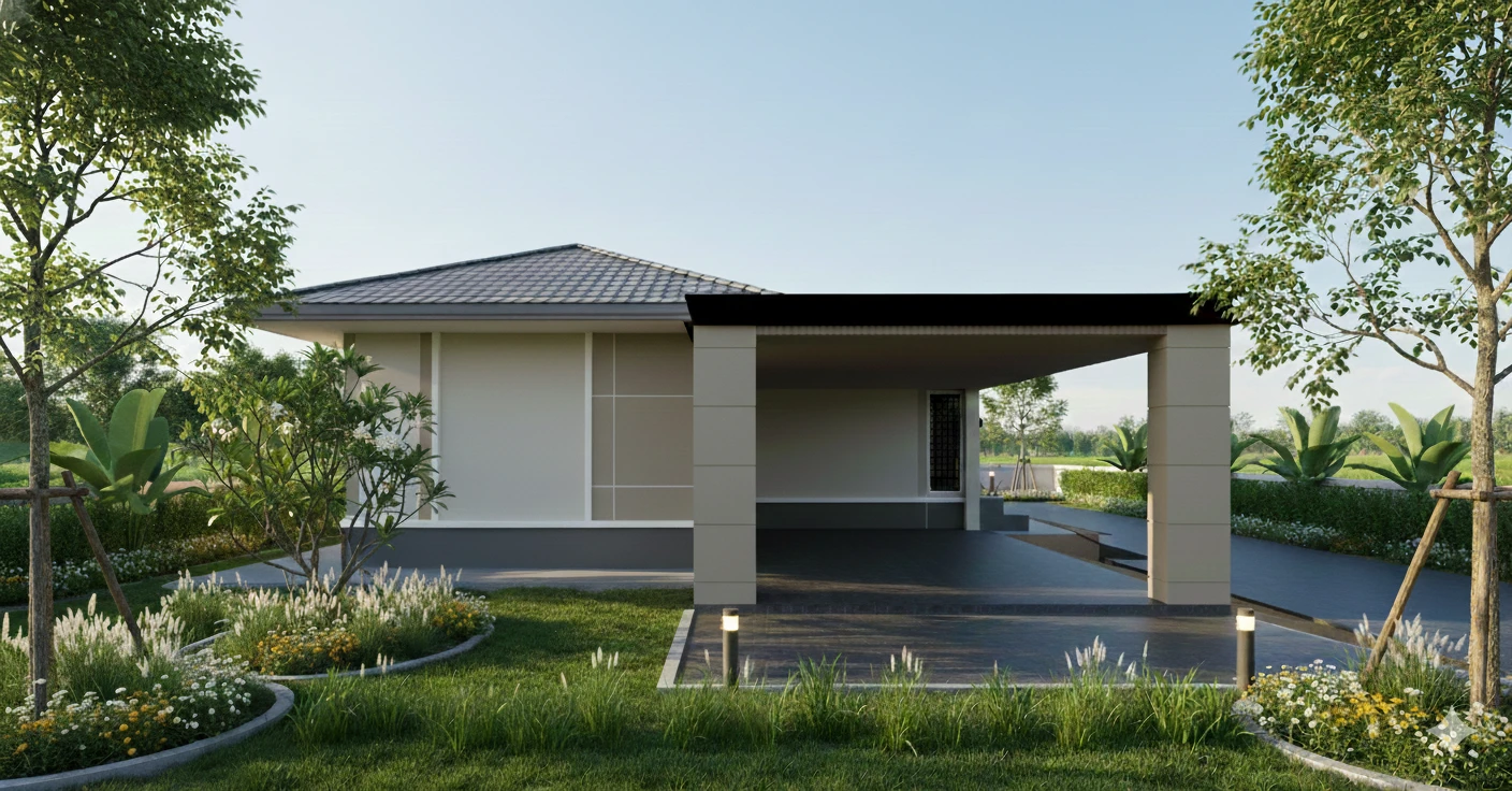บ้านชั้นเดียวสไตล์คออนเทมโพรารี่ พื้นที่ใช้สอย 140 ตร.ม. ที่สามารถแบ่งเป็น 2-3 ห้องนอน 2 ห้องน้ำ 1 ห้องโถง 1 ห้องครัว 1 ห้องเก็บของ 1 โรงจอดรถ