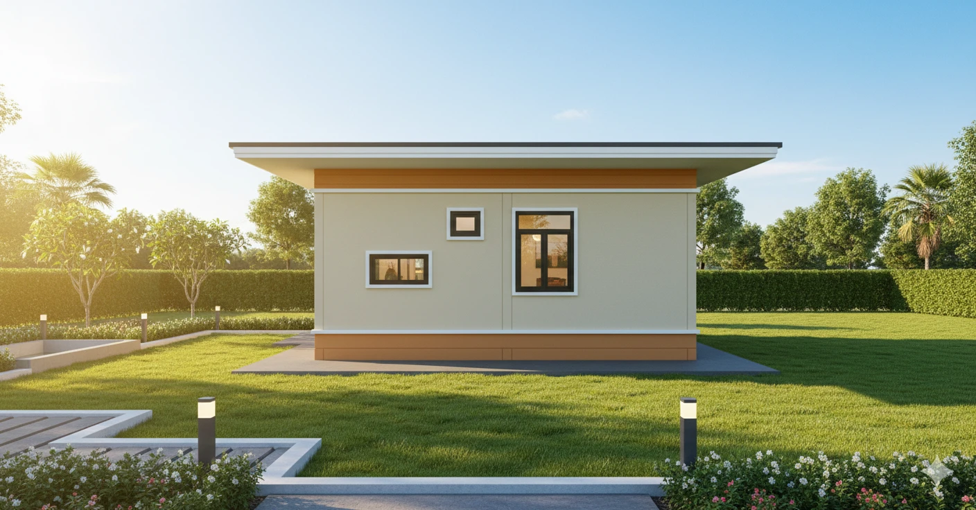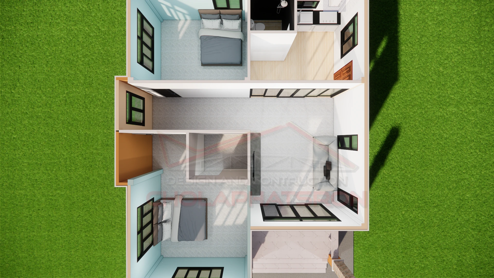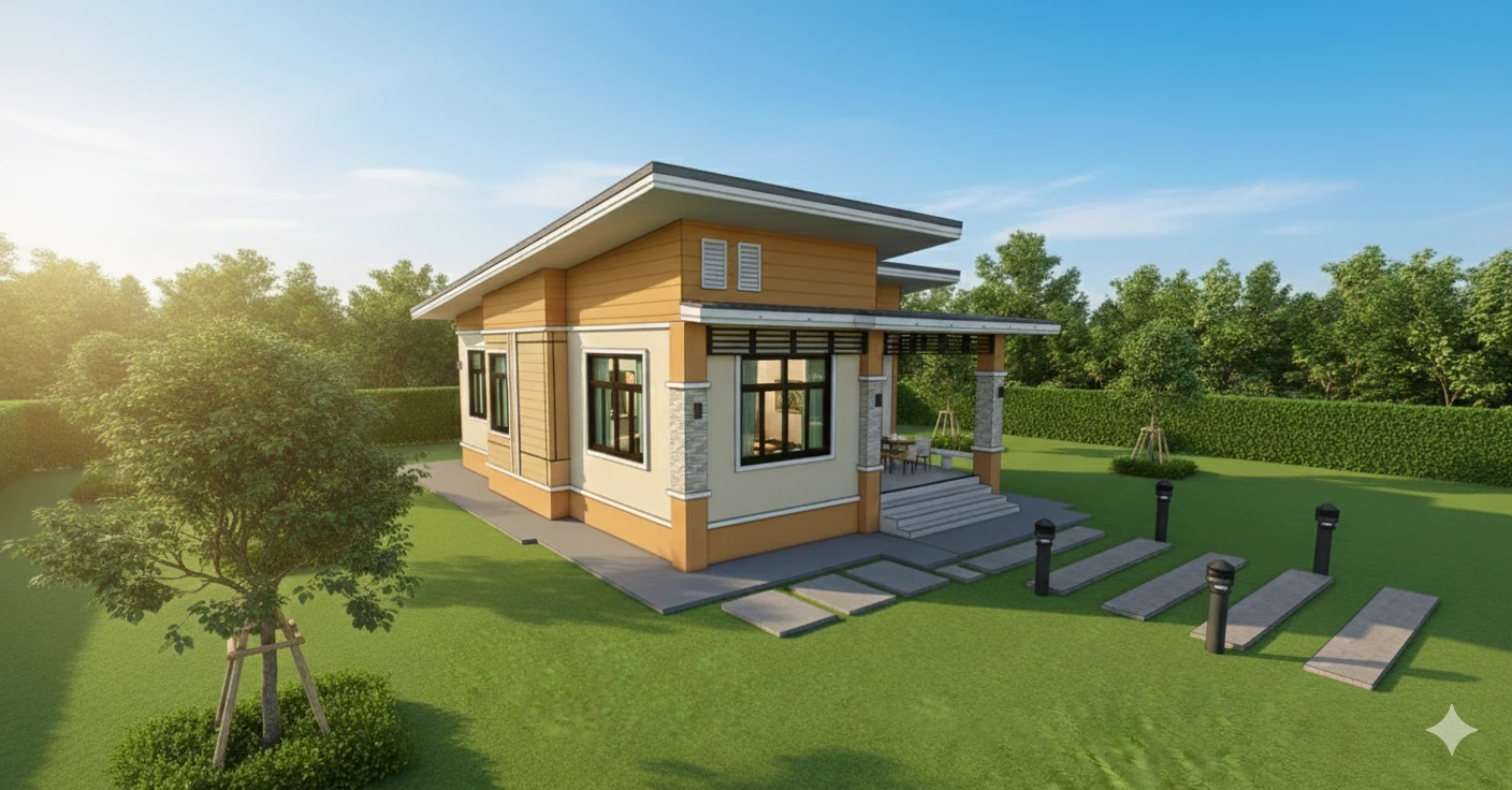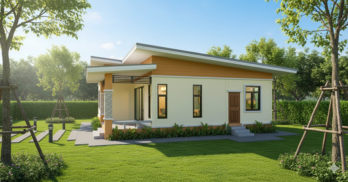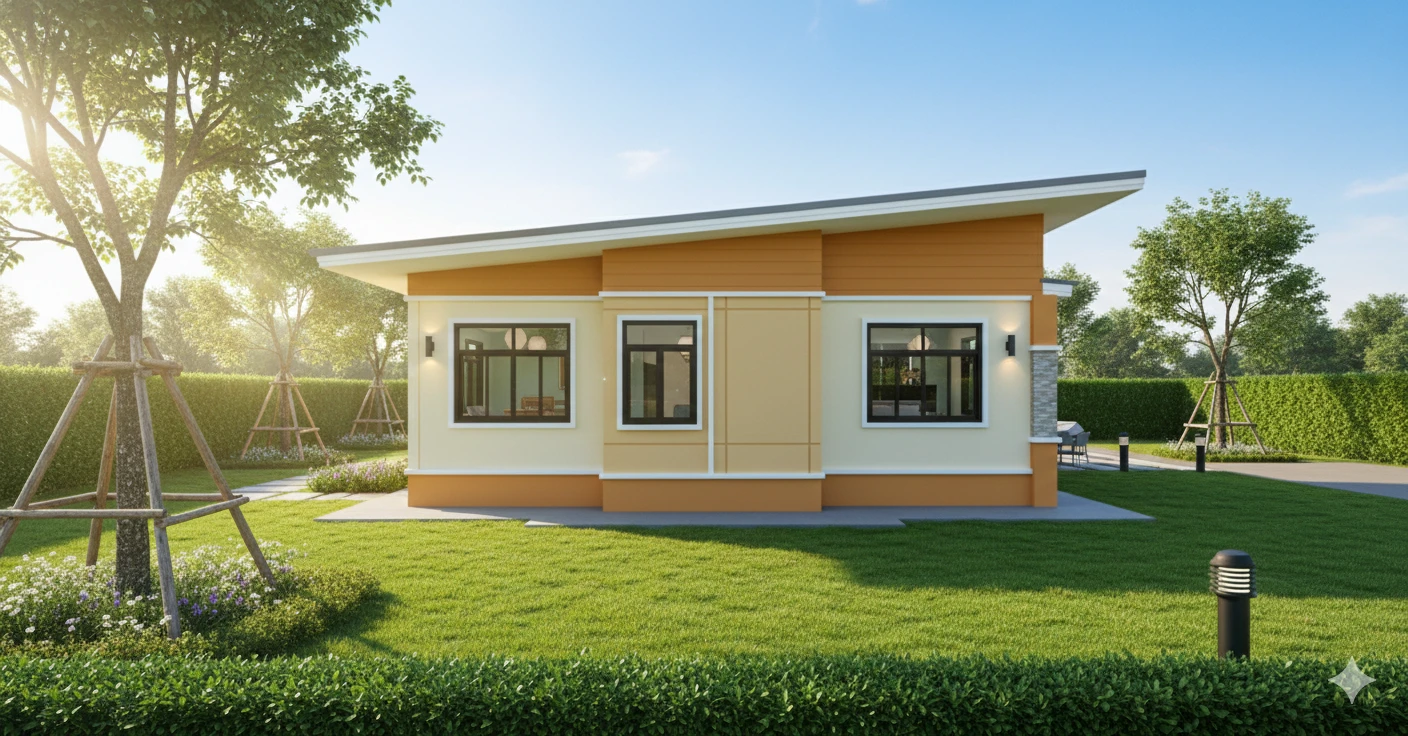 บ้านเดี่ยวสไตล์โมเดิร์นเรียบง่ายอยู่สบาย สีตกแต่งตามความต้องการของผู้อยู่อาศัย พื้นที่ใช้สอย 100 ตร.ม.โดยแบ่งเป็น 2 ห้องนอน 1 ห้องน้ำ 1 ห้องรับแขก 1 ห้องครัว และห้องเก็บของที่กว้างขวางอีก 1 ห้อง ในงบประมาณการก่อสร้างเริ่มต้น 1.1X ล้านบาทเท่านั้น