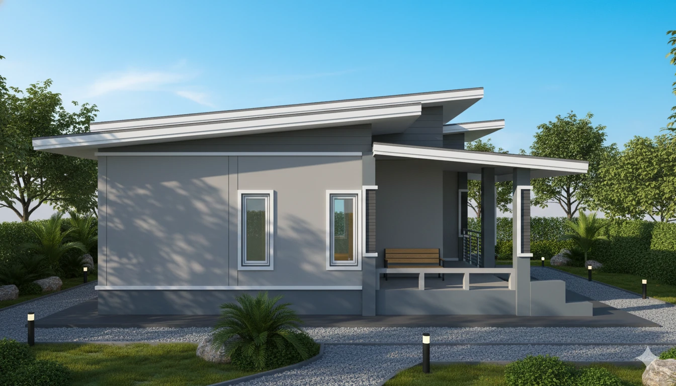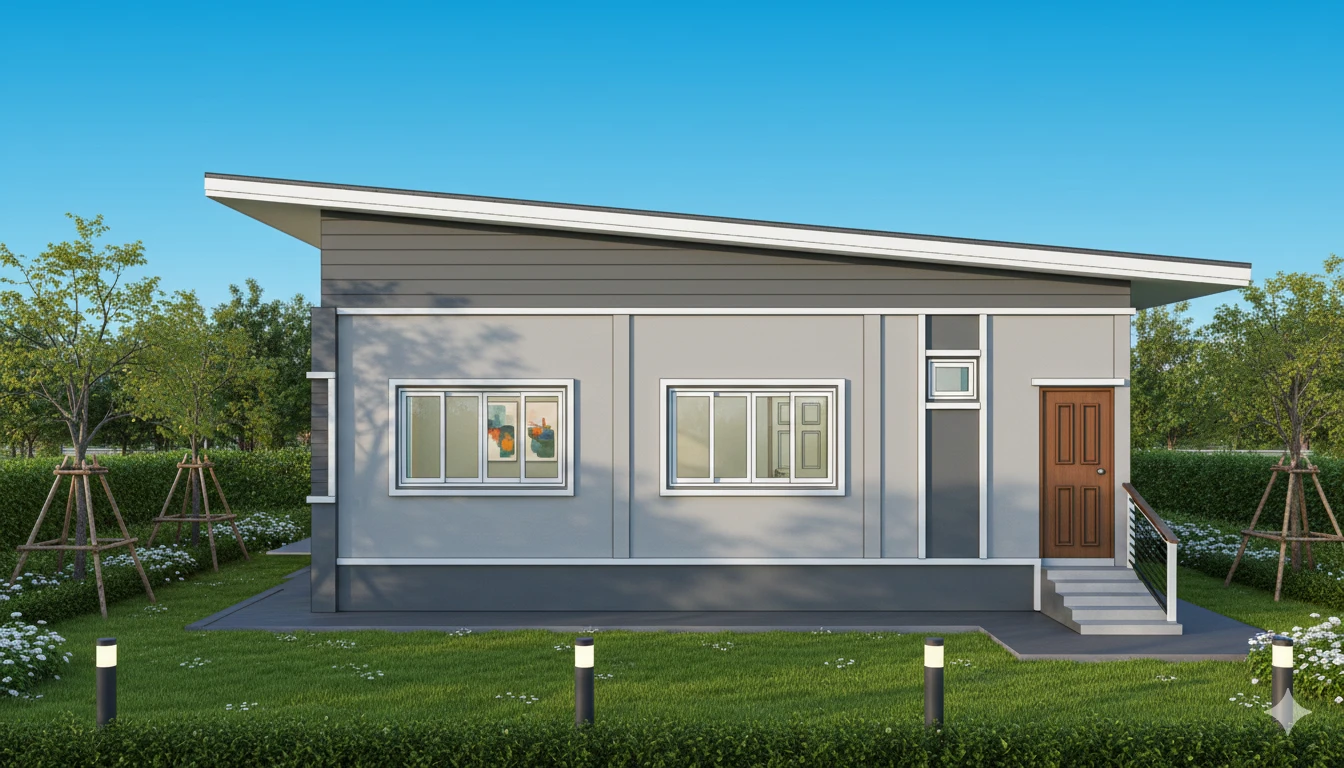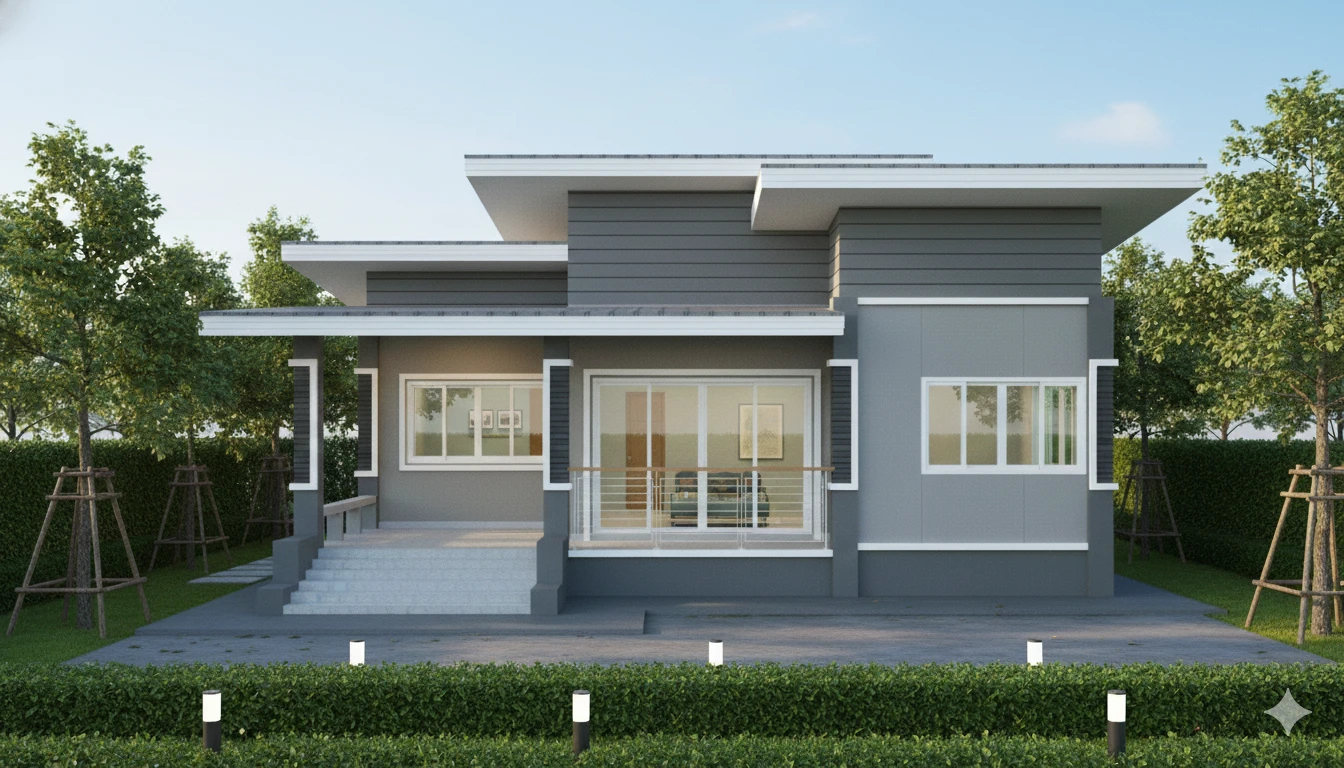 บ้านชั้นเดียวสไตล์โมเดิร์น พื้นที่ใช้สอย 95 ตร.ม. โดยแบ่งเป็น 3 ห้องนอน 1 ห้องน้ำ 1 ห้องครัว 1 ห้องนั่งเล่น